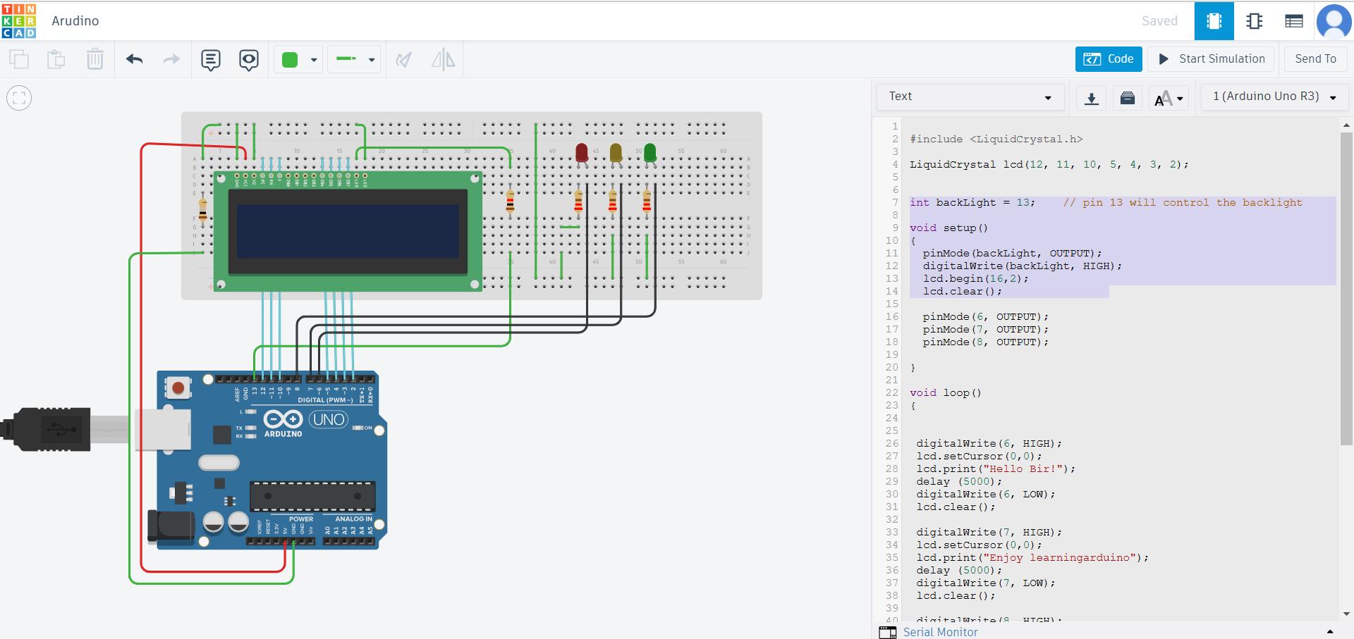 There are 3 lights (LEDs) connected to pins 6, 7, and 8. These lights can turn on and off.Each light will turn on when a specific message is shown on the screen. I used the code given below to simulate my circuit. I used code by [Nishan] (https://www.tinkercad.com/things/ceAEfbIE0Yd-arduino-lcd-and-led-)