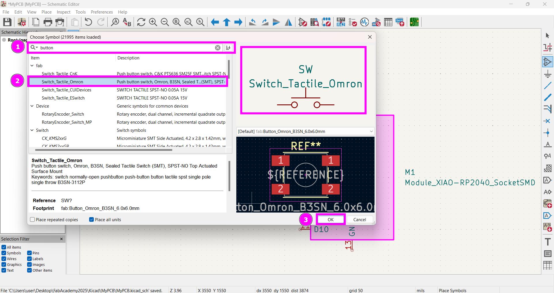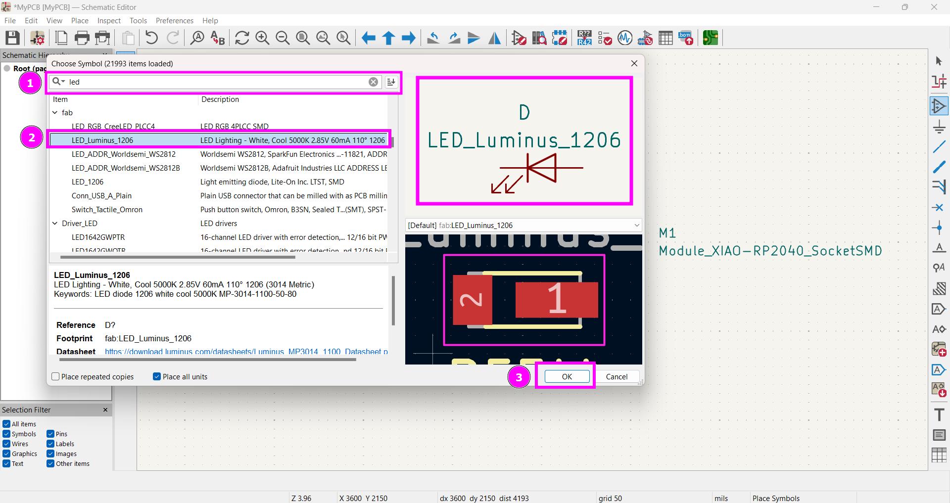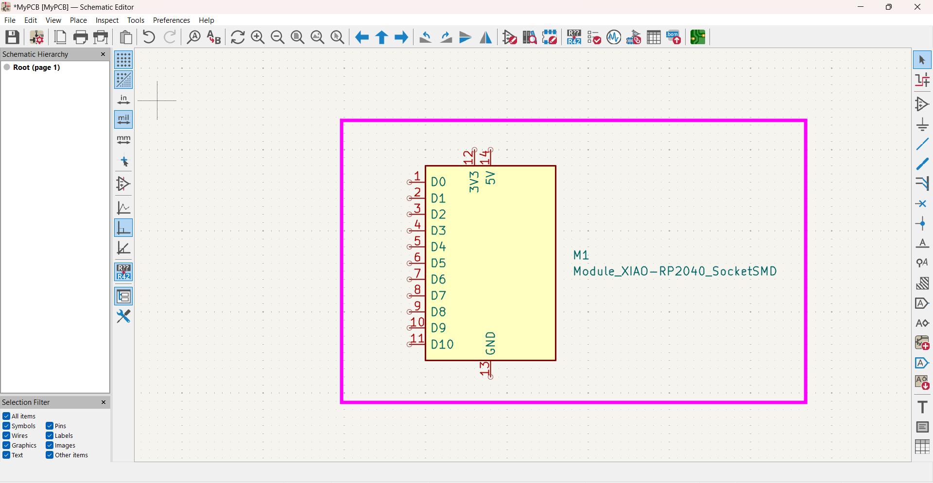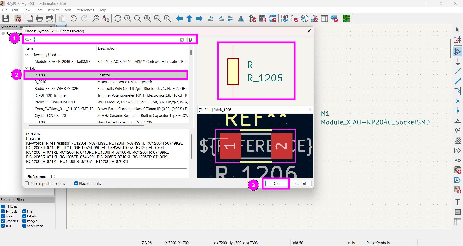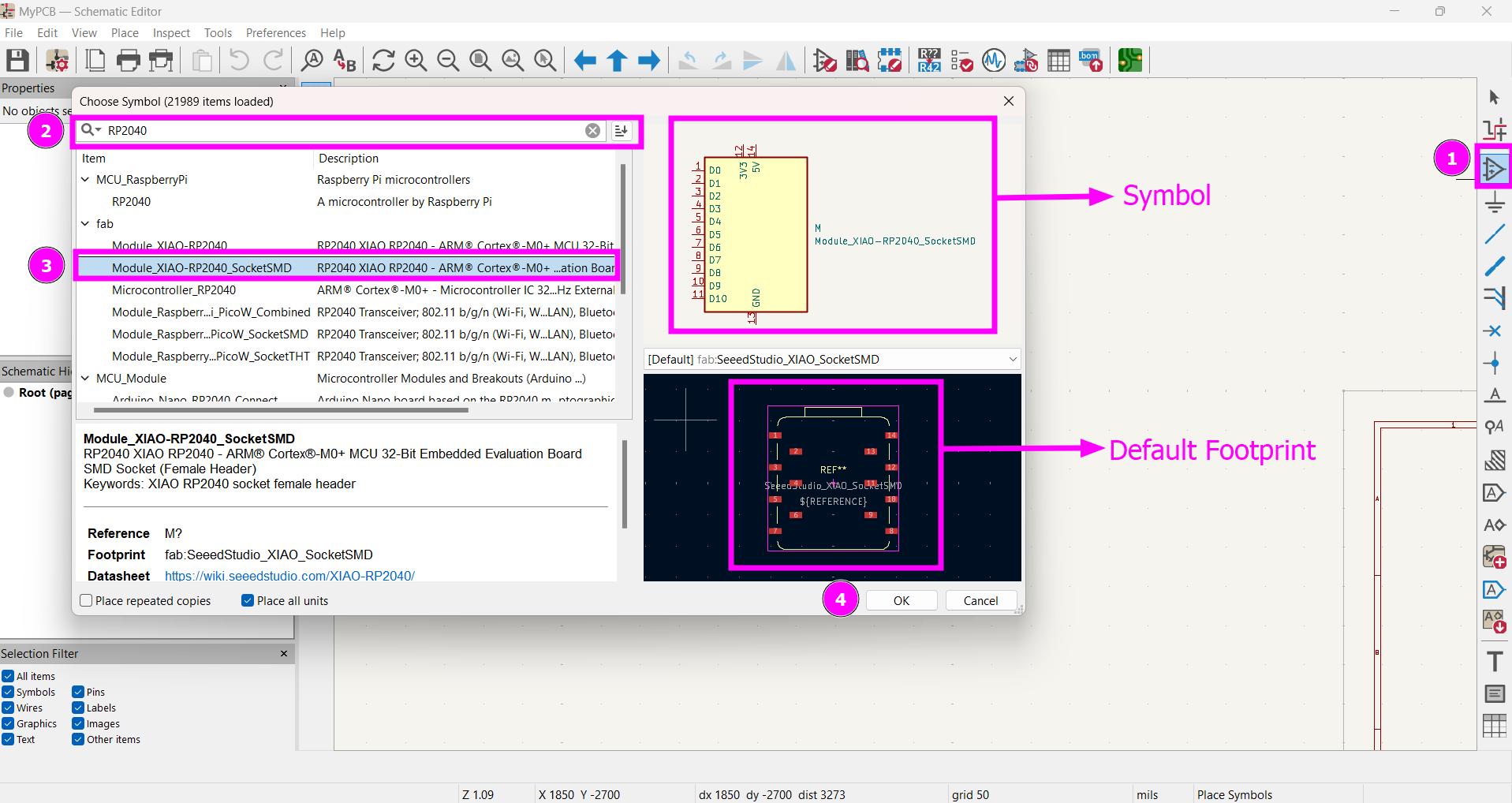 Now that I have added fab libraries for both symbol and Footprint, I will start with the schematic design for my PCB by adding symbol of RP2040 (SMD).