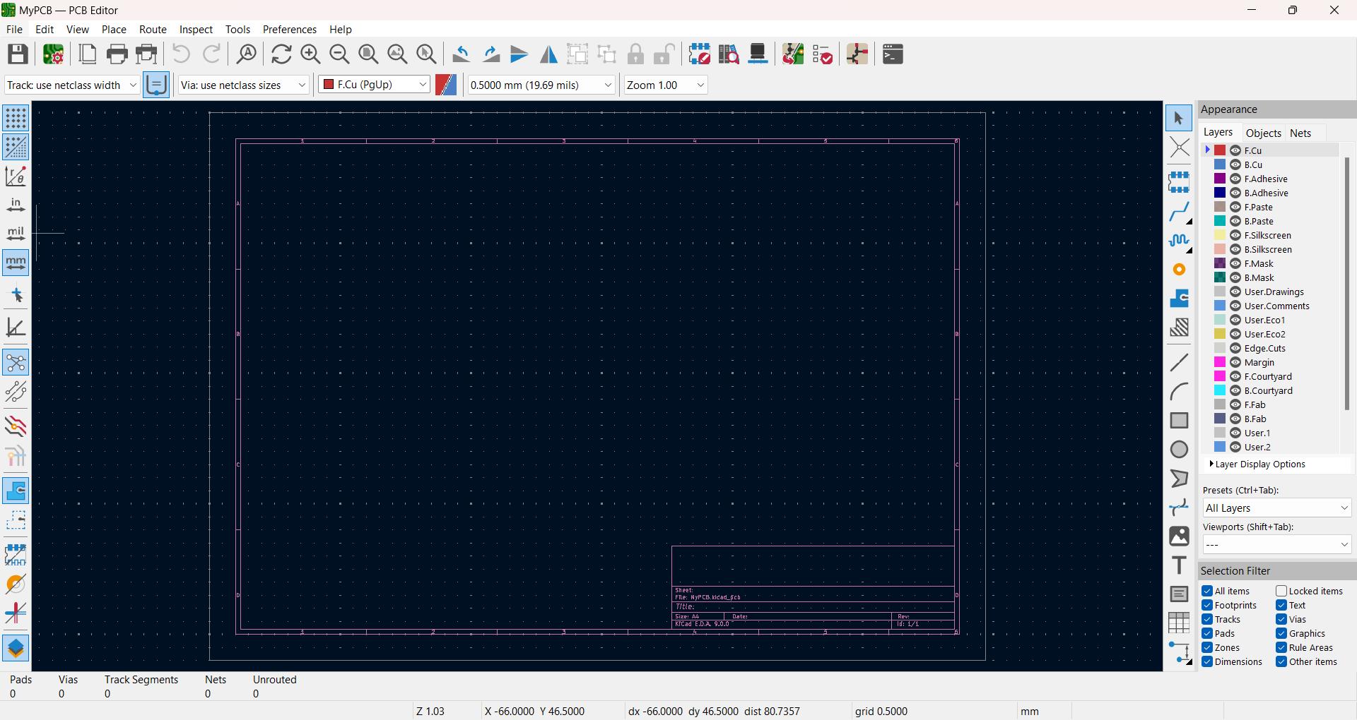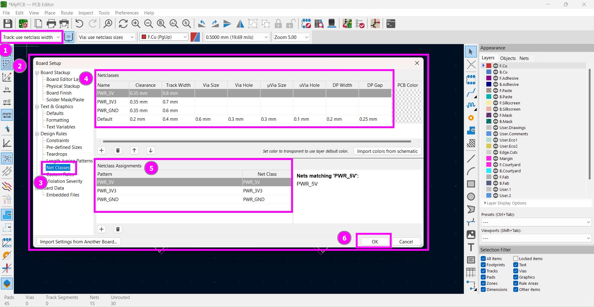Now, define clearance and track width for each type of wire line used in your circuit ( you have to define via size and via hole if you are planning to design 2 or more layer PCB).