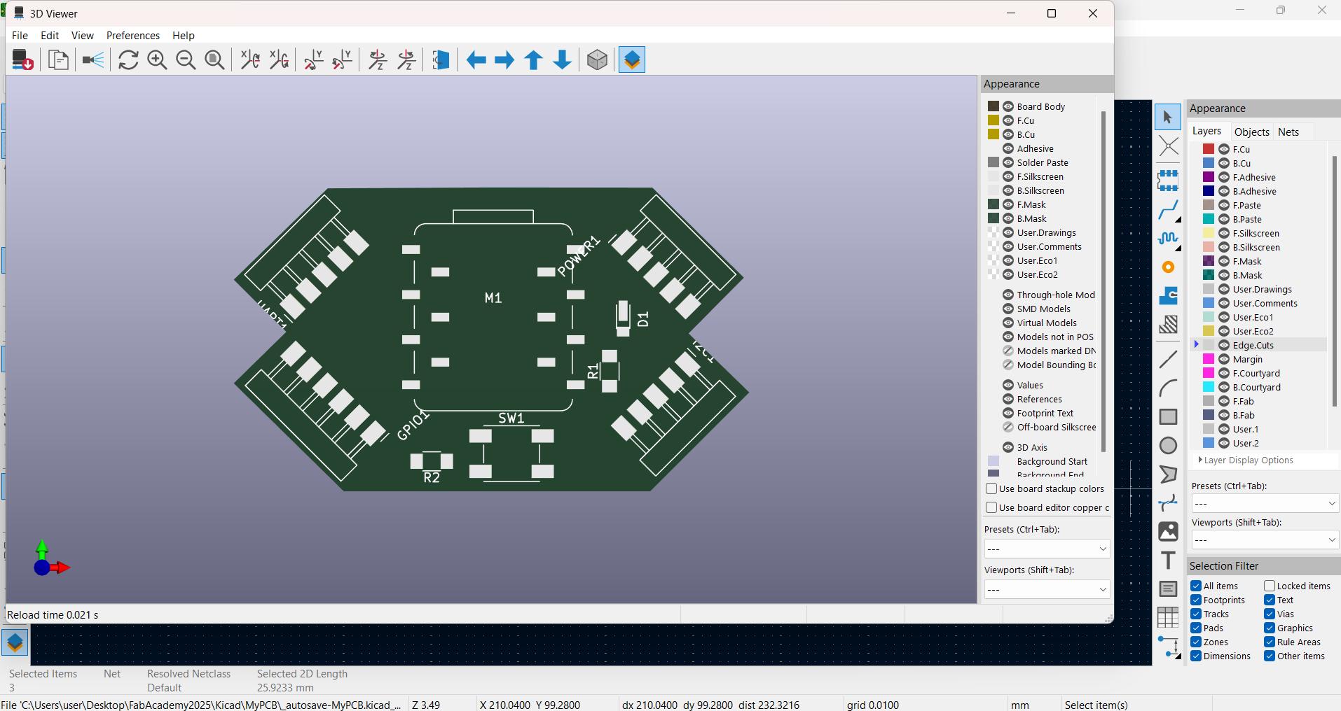 Create Edge Cute so that you can actually get an idea how to fit all your traces on the shape PCB you want to create. I preview my PCB and I does not look that good. I think I have to change it.