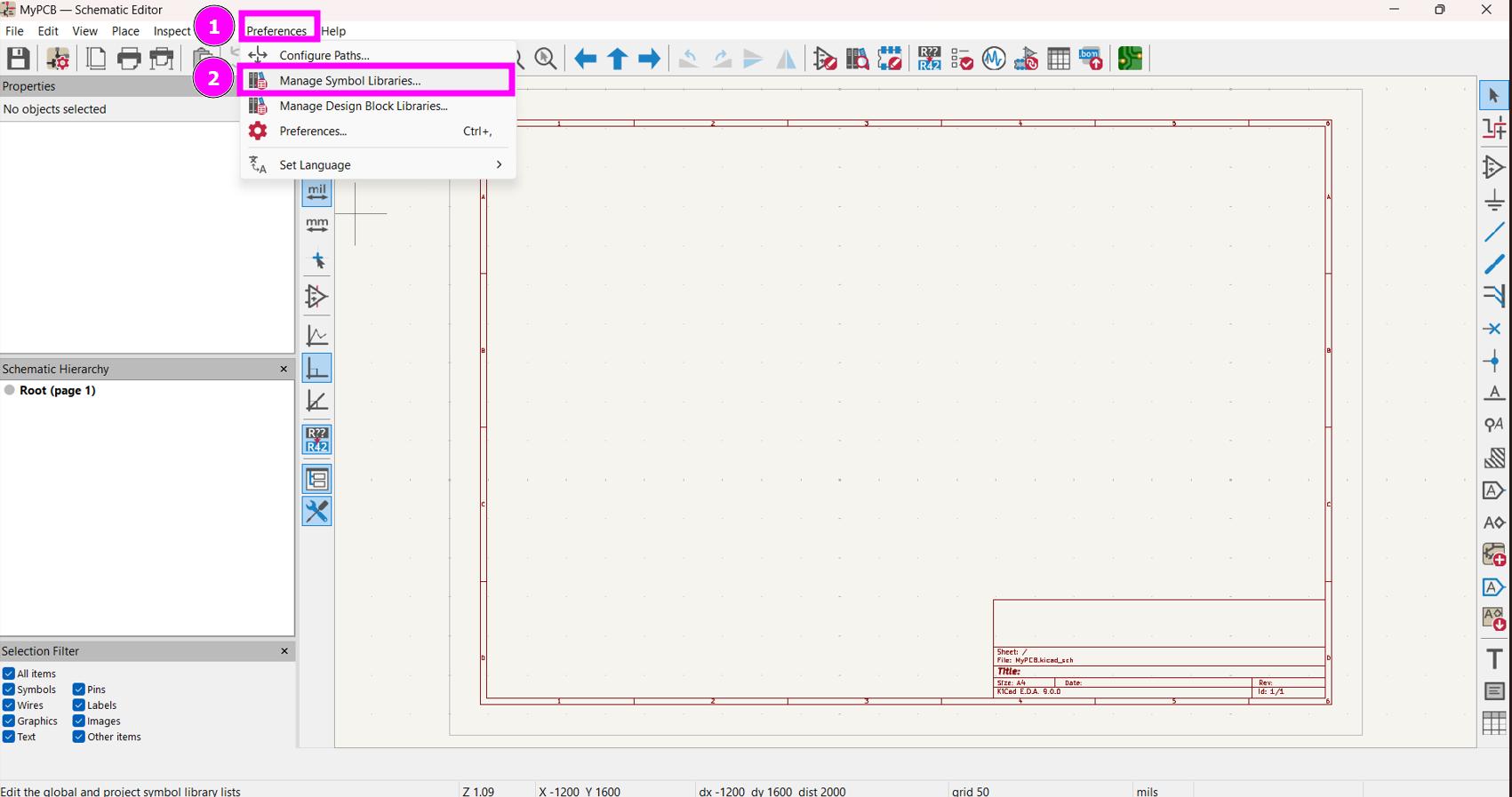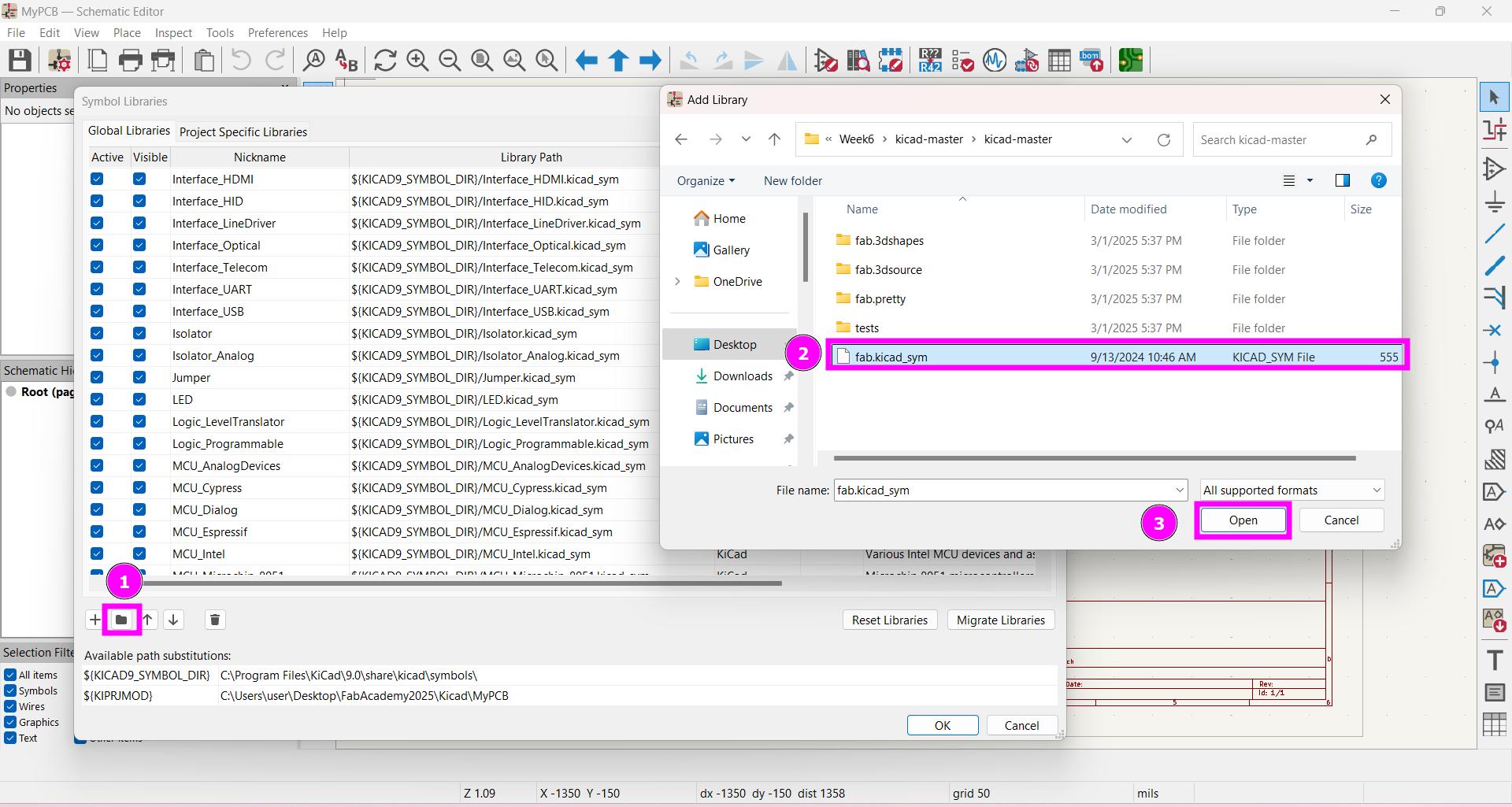 Click on Preferences*>>Manage Symbol Libraries** to add fab Libraries for symbol.
