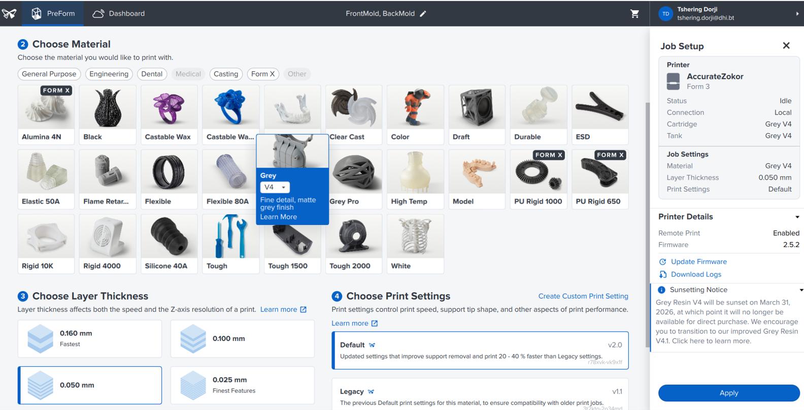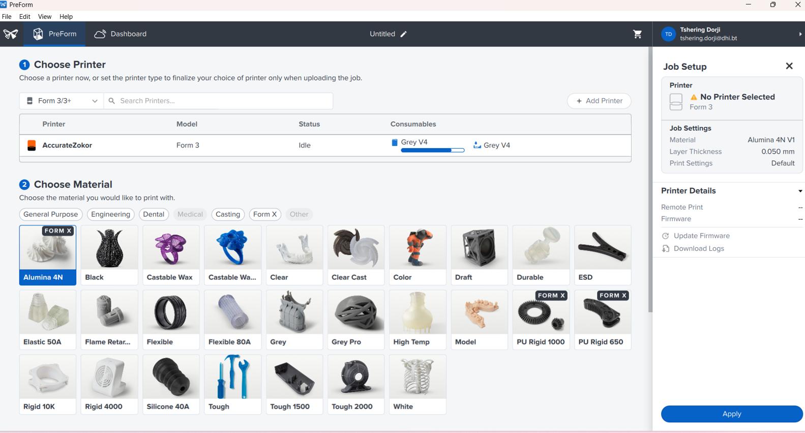 - I opened the software and choose the Formlab 3 which is up and running in our lab.