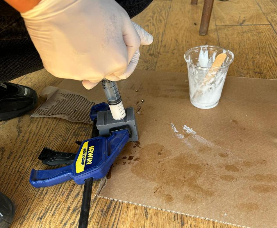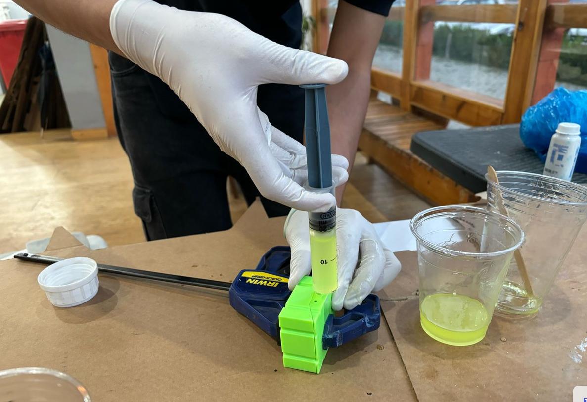 I try to suck the Liquid Polyurethane by Syringe but it can not really suck it due to hight viscosity of the liquid. Therefore, I open the syringe and pour the Liquid Polyurethane into Syringe.