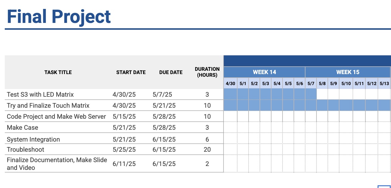 I need to figure out how to make my LED matrix touch-activated. I have a few ideas that I am in the process of testing right now.