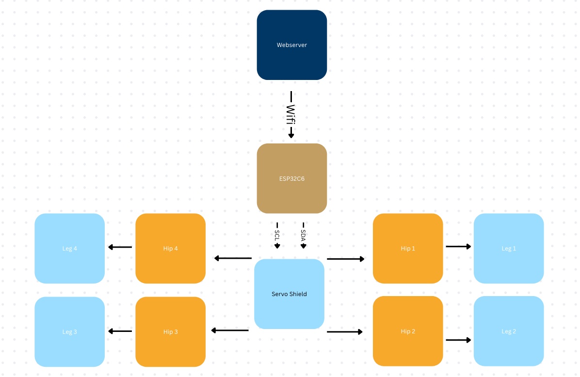 This week I also worked on designing my board for the final project. I took what I learned from Output and Machine Week to make the board. It has 4 pinheaders that are 3x1 for the legs and another 3x1 for the tail servo. I also have two pinheaders that are 2x1. One is for the external power supply and the other is for the rx and tx pinouts for the step responce. Finally I have the ESP32C3 as my microcontroller as it gives easy access to a web server and I have been using them for all the weeks up to now.