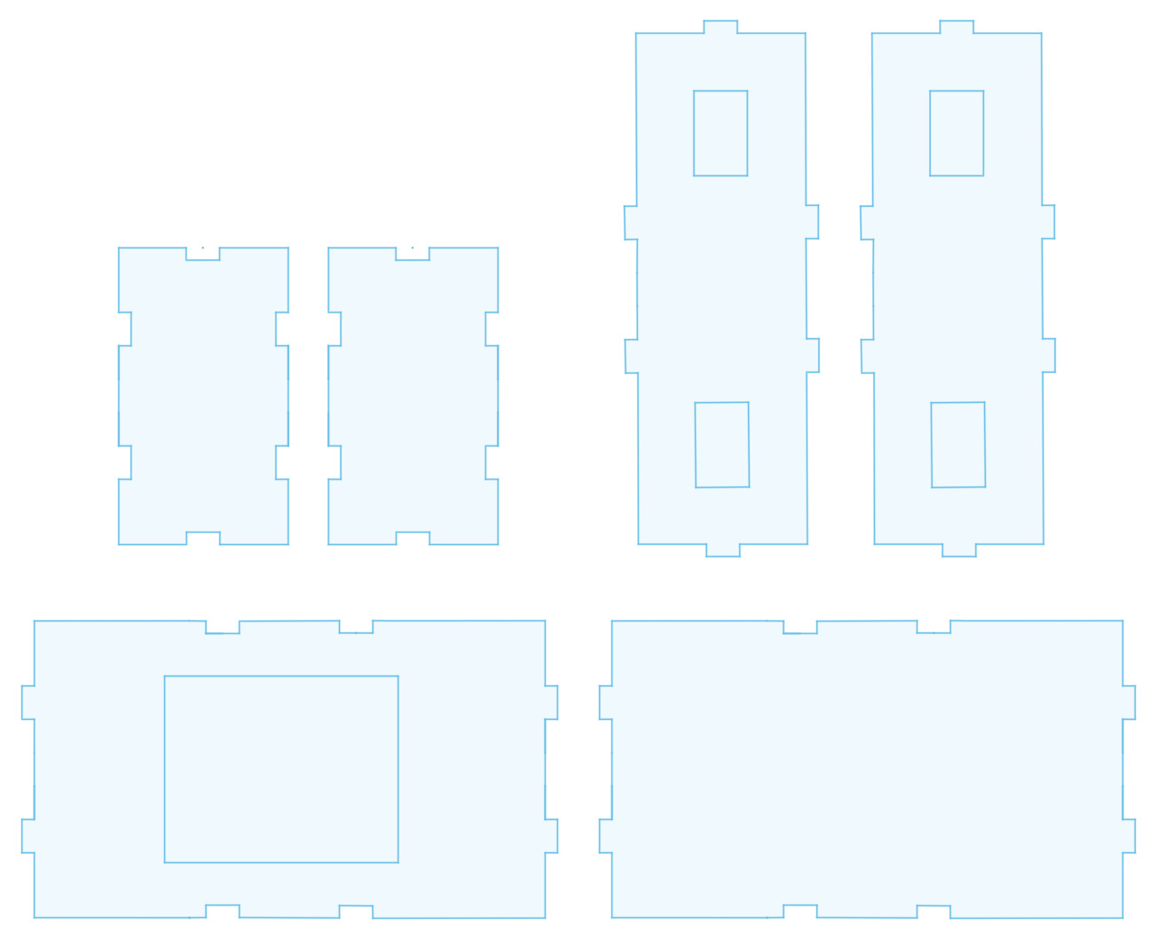 Finally I made the top and bottom pieces of the case. These were similar to the front/back piece as they had space for the tabs. They are near idential except the bottom piece has an open middle area to activate power and easy access to the wires. Heres what they both look like: