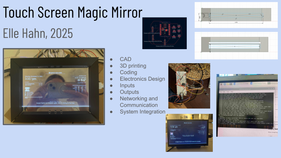 In the furture I would love to advance this project more by making it possible to play a movie or just for the mirror to do more things. I would also love to figure out a way to connect my alexa to the magic mirror because then it would b voice activated and touch screen.
