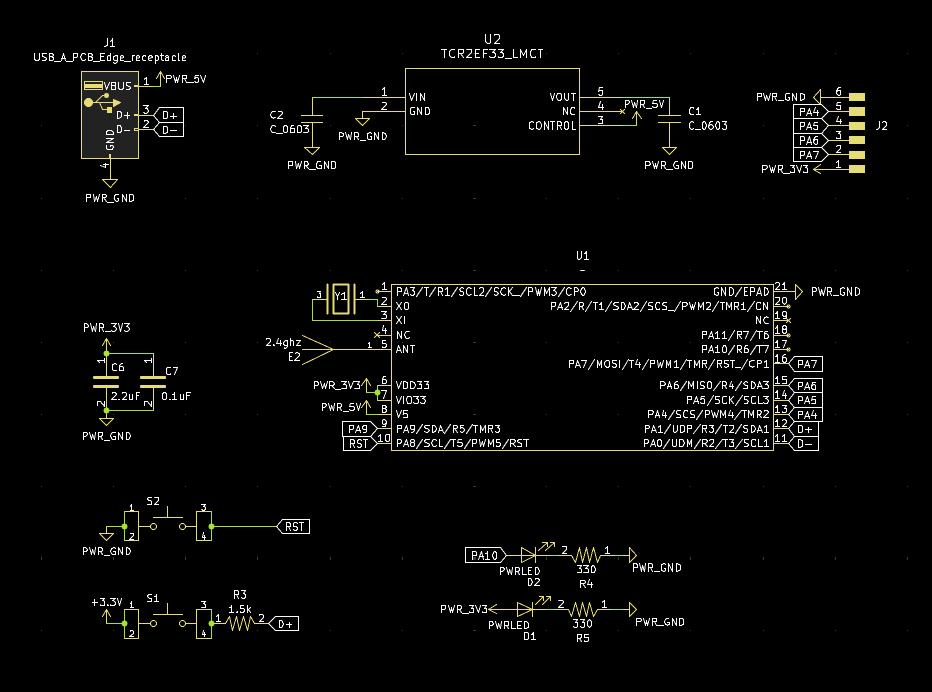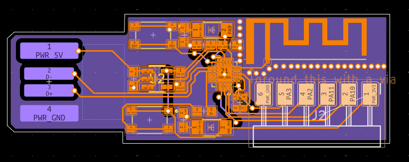 I really cooked here. The first placements were getting the pins and antenna facing away from eachother, and then I saw it fit the size of the USB-A so well, and fit the ch572d in the middle. This is probably my first board that looks actually halfway decent aesthetically. I sadly didn't use curved traces on this one, since I was still experimenting with my style at that point