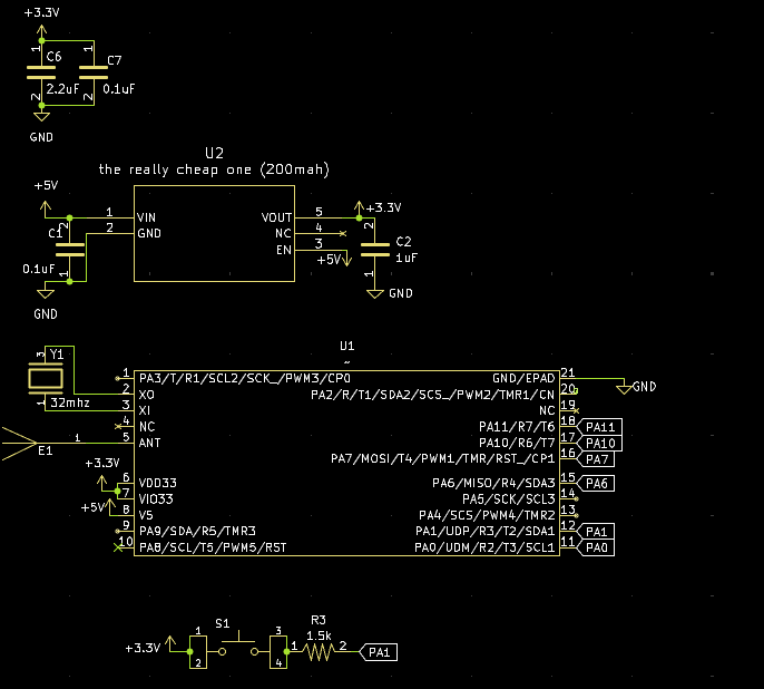 Nothing really special here, just the run of the mill ch572D circuit that I've used a bunch of times now. Only weird thing is that I actually put a reset button on this one, and put a second led that I lowkey just realized I didn't connect to anything whoops. It would of been connected to pin 10 for debugging. I guess excluding the 2 LEDS, its (maybe) the lowest amount of passives for the ch572D