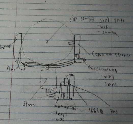 This sketch outlines the major electronic components of the camera. In order for it to be able to rotate infinitely along its base, it needs to have no wires connecting the base and the head, or a slip ring. When I was researching it, while a slipring seemed interesting, I have more experience with batteries and decided to go the disconnected route. It would probably be more reliable or at least easy to replace an old battery than a broken slip ring. I also have some experience with stepper motors when experimenting with making a gantry for them, so I decided to go with a thin stepper for the one connecting the head to the rotatable base, and a larger one connecting the rotatable base to the unmoving base.