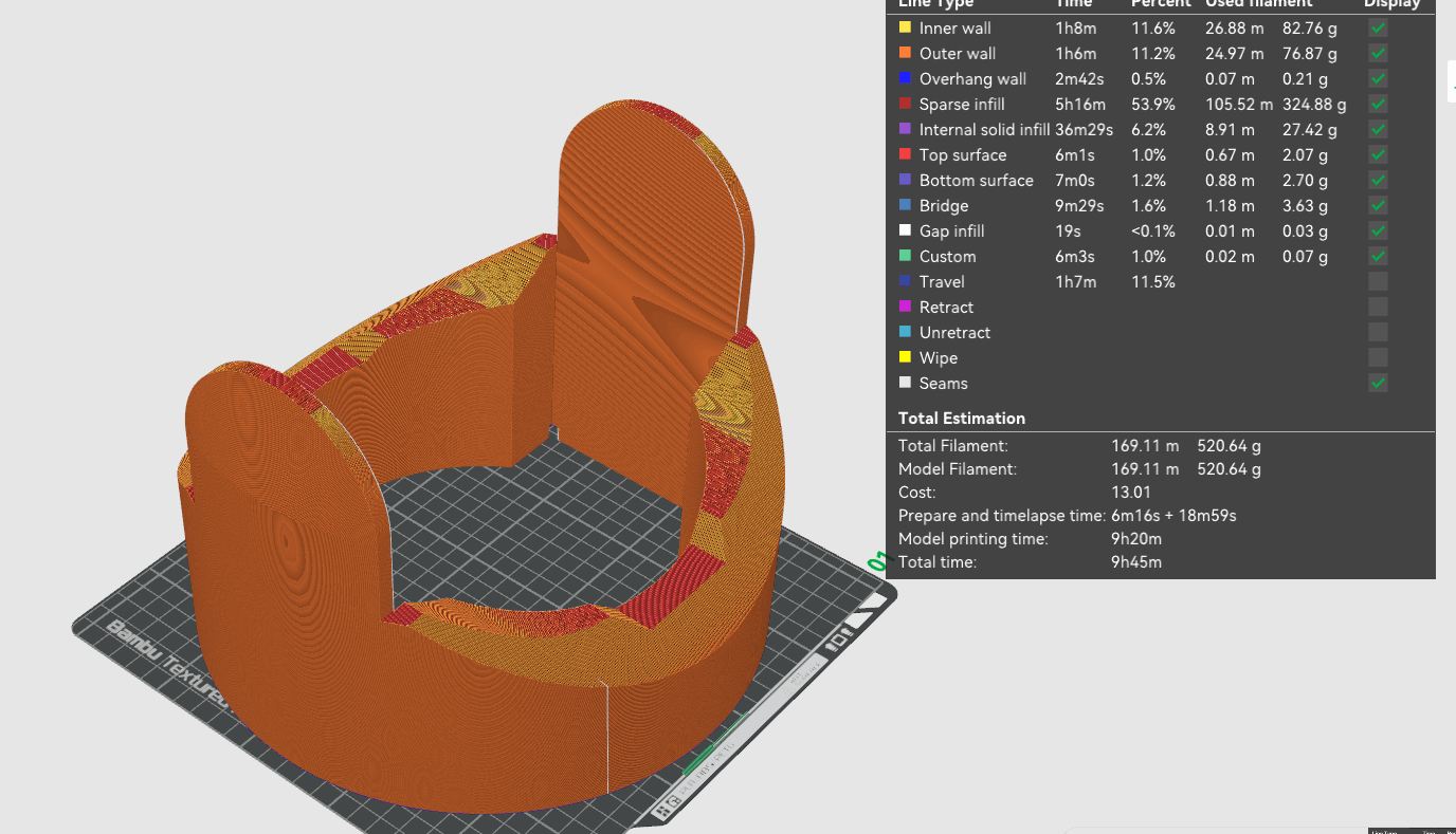 Heres why I wanted to optimize. The current model was 500 grams for just the midsection, but I am confident I can get it down to under a kilogram of filament for at least the 2 parts of the base.