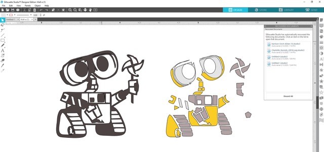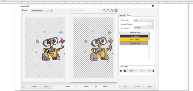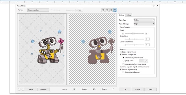 B. After finding this picture I cropped out the robot called Eve (a friend of mine created her) so I just had wall-e and then sent him to CorelDraw where I could separate the outlines of Wall-e by color. It is a very usefully feature for vinyl cutting and anything else where you need to find a way to separate things simply based on color.