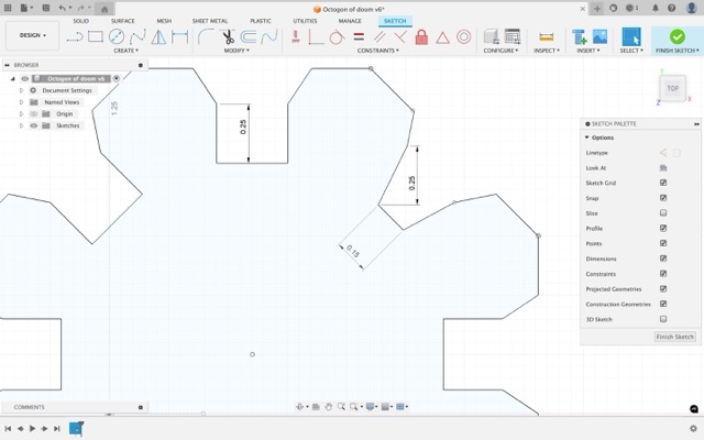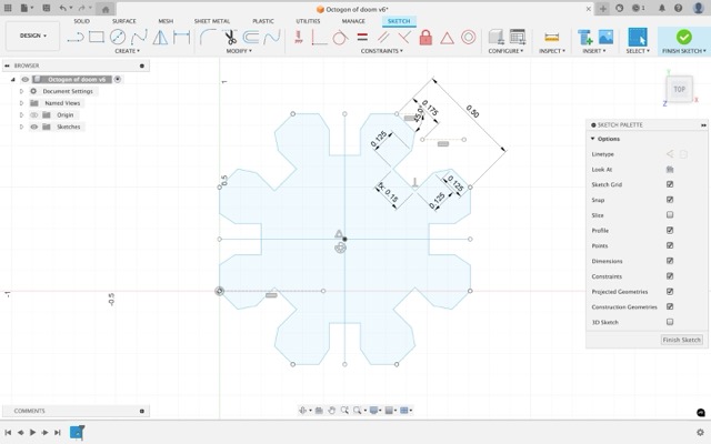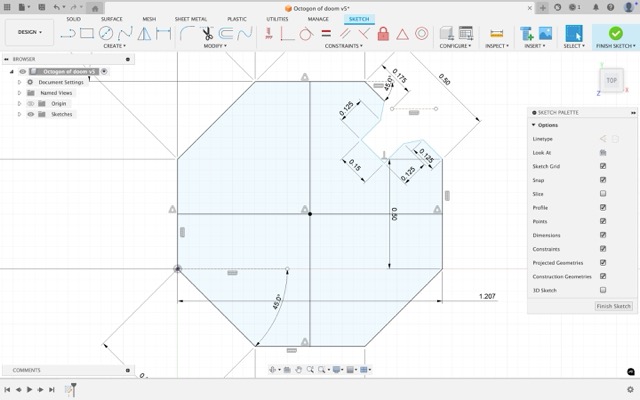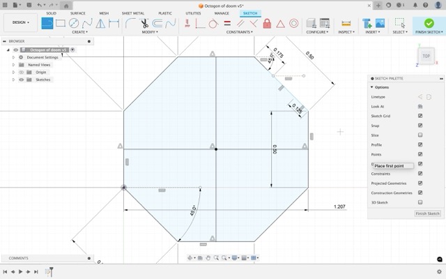 A. At first I created the basic outline of the octagon by creating 4 lines at a 45 degree angle and another 4 at a 180 degree angle in Fusion 360’s sketch.
