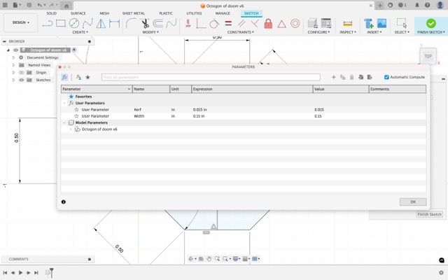 B. After creating my shape I decided to cut out a chamfer joint for each of the 8 sides, to do this I first needed to define the parameters of material width and kerf. The material width was 0.15 inches while the Kerf was 0.015 inches. You can go to change parameters by hitting s and then typing in parameters.
