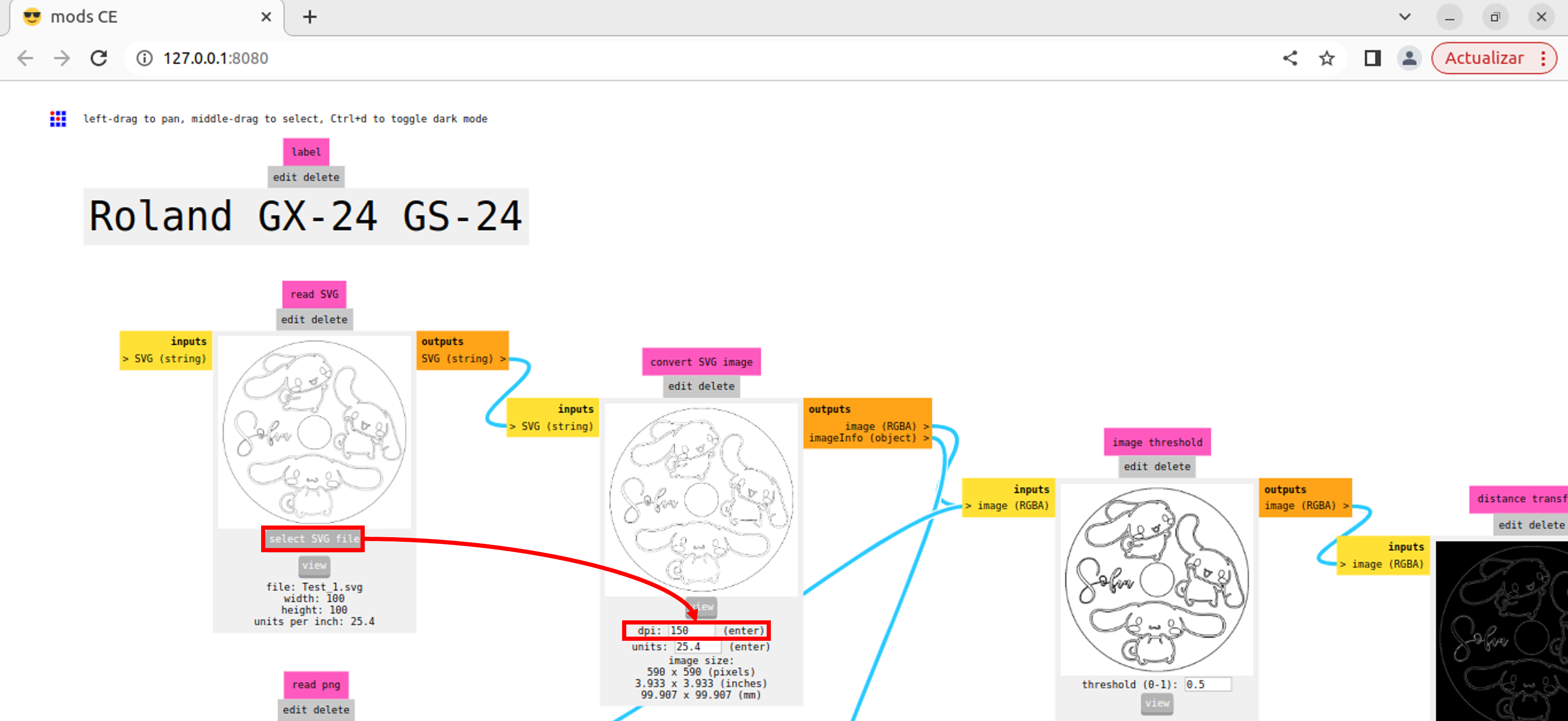 📝Note: For this example, I used 150 DPI. When I tried other DPI values, the preview didn't show the complete toolpaths. I believe this is related to the size of the design, meaning that the DPI setting must be adjusted according to the dimensions of the file. It's something I'll need to explore further in future tests. 👀 - Here are the examples: