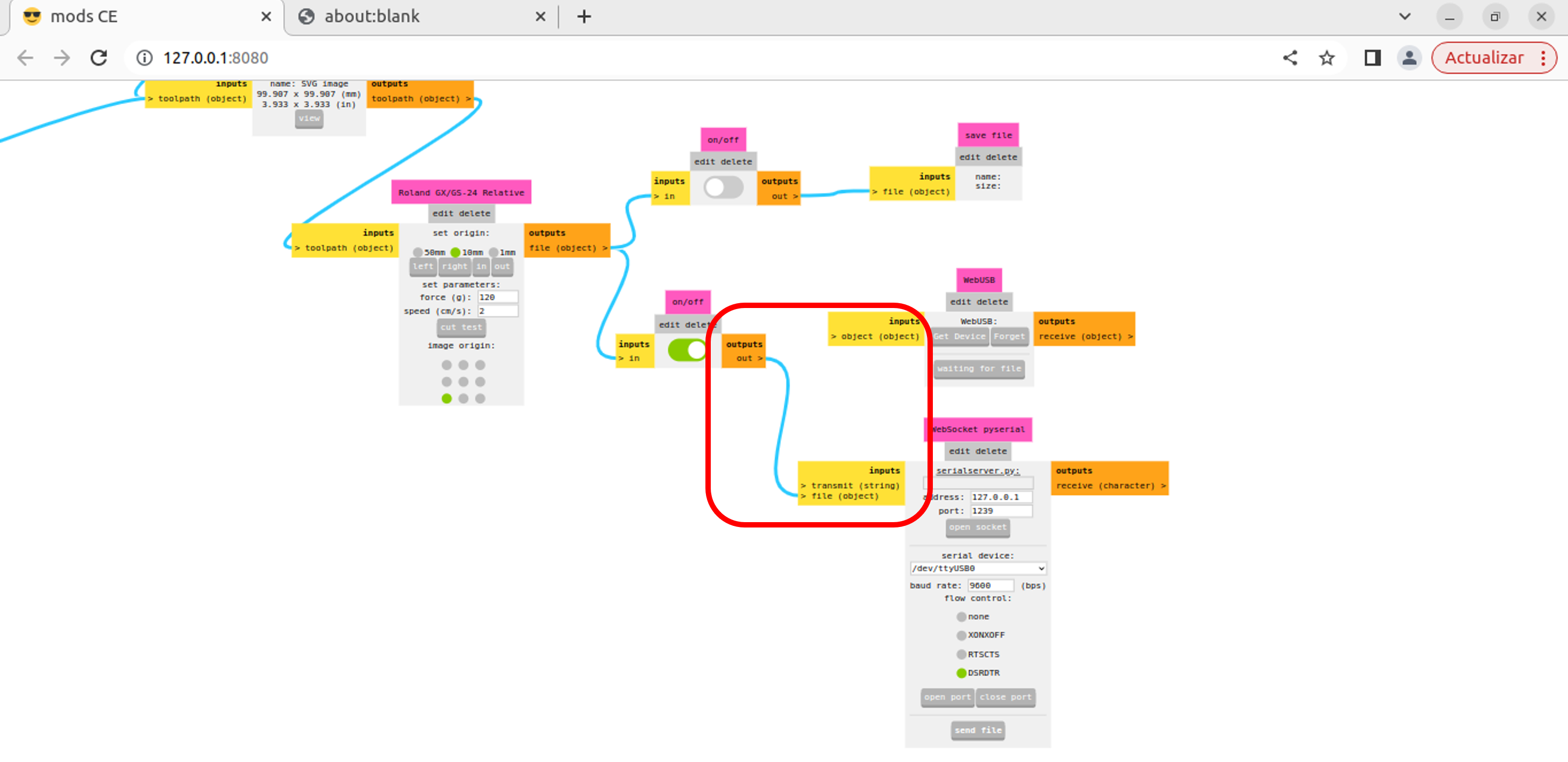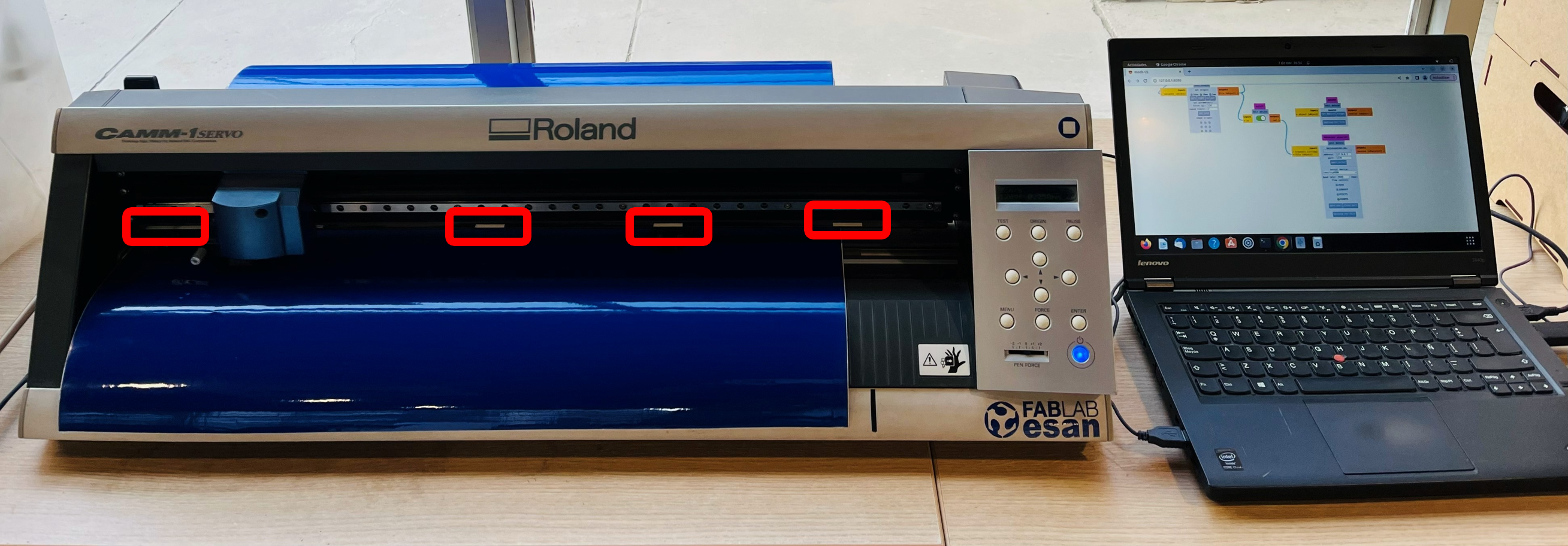 Once the machine is selected, the next step is to add the module that connects the vinyl cutter through the serial port. This connection allows the machine to communicate with the computer so that, once the file is loaded, the cutting job can be sent directly to the Roland. The complete workflow can be seen in image (3).