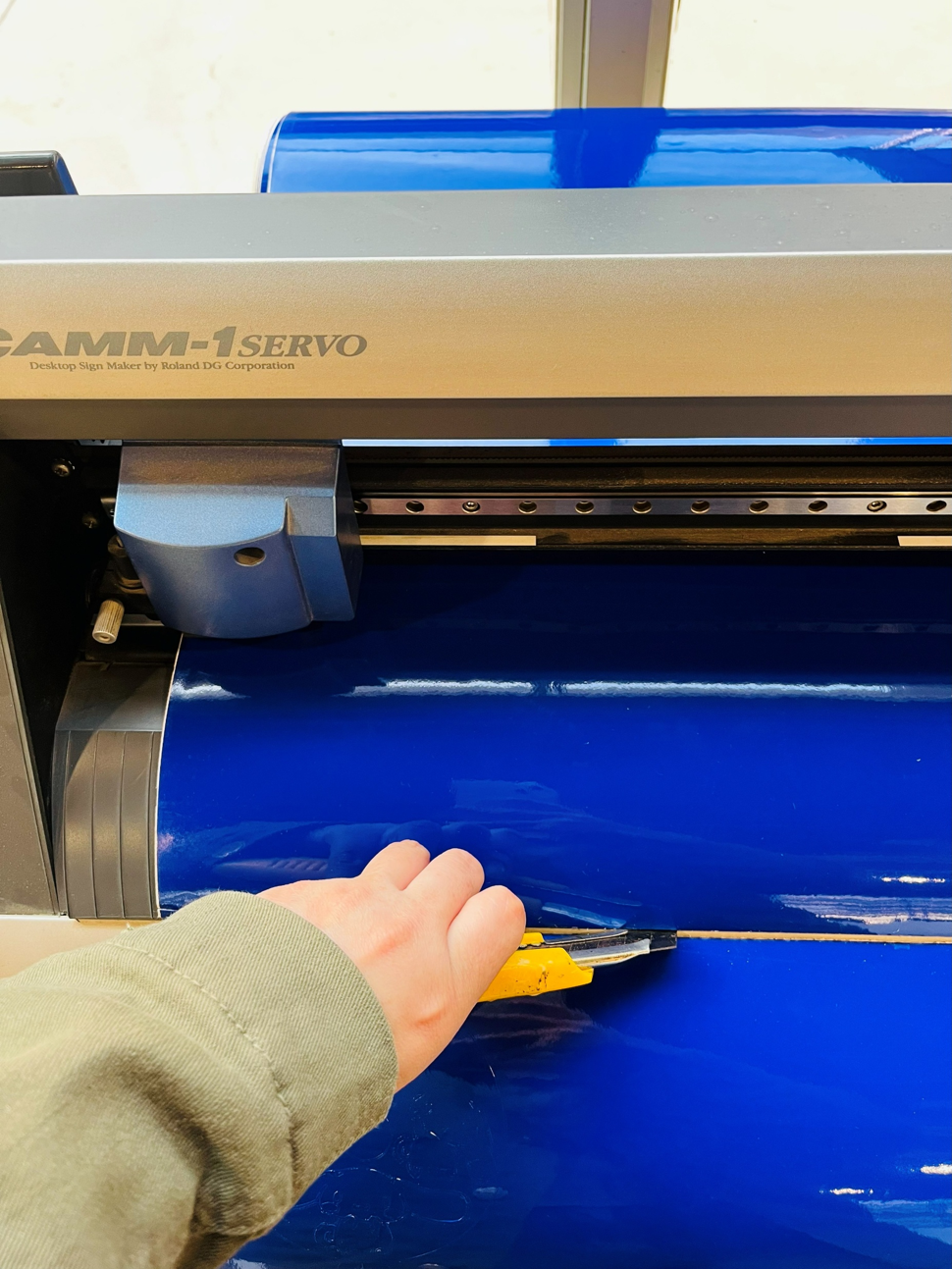 After finishing the cut, I needed to remove the material from the machine. For this, I used a cutter knife to trim it off. The vinyl cutter has a small built-in cutting section that makes this step easier, as shown in the image. And with that, the cutting process was complete — the design was ready for the next steps!
