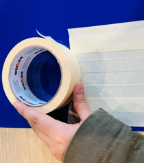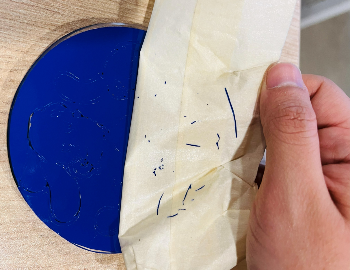 - After applying the transfer sheet, I carefully placed the vinyl onto the glass surface, pressing it firmly to make sure it adhered well. Then, I started removing the areas that would be sandblasted, leaving only the parts covered with vinyl to protect them during the process.