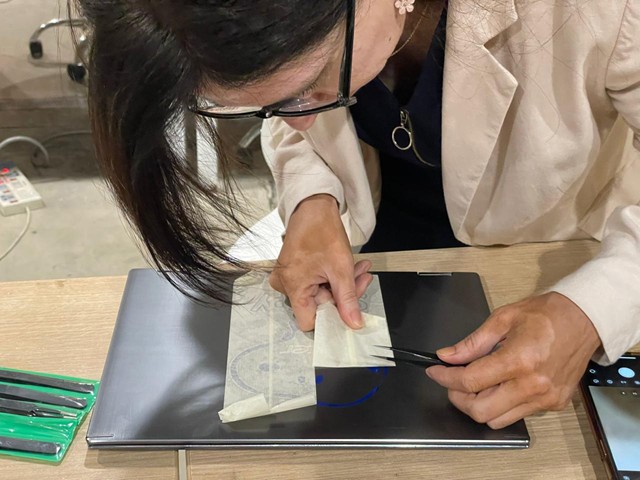 k. I remove the transfer paper and with the help of tweezers I make sure that only the vinyl remains stuck to the new surface.