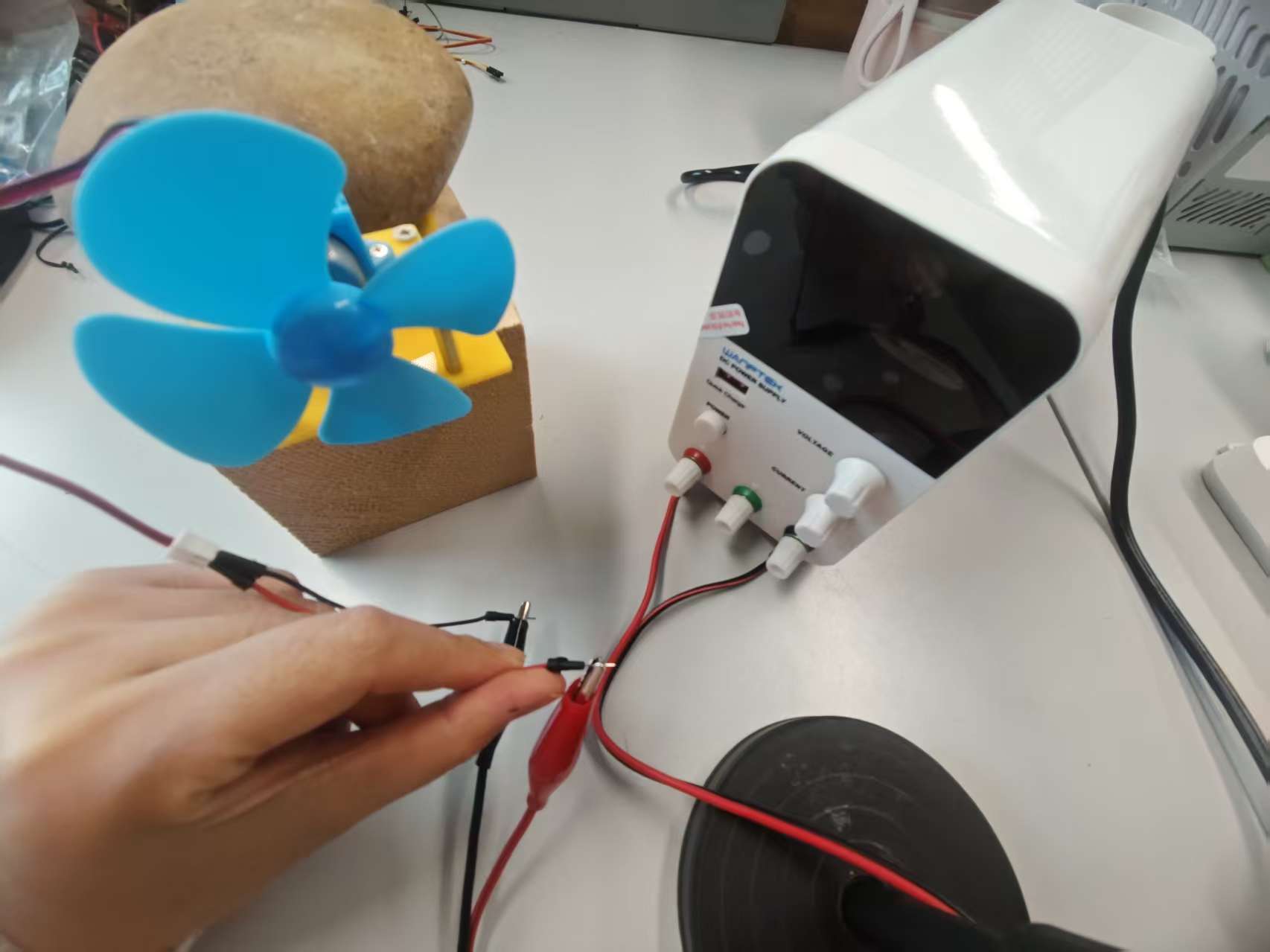 We set the maximum voltage to 2V and used the constant current (CC) mode to observe the changes in voltage and the motor’s movement. The larger the current, the higher the voltage; conversely, the smaller the current, the lower the voltage. According to the formula P = I × V, the power consumption of the DC motor decreases accordingly. When the current is less than 0.05A, the motor stops running.