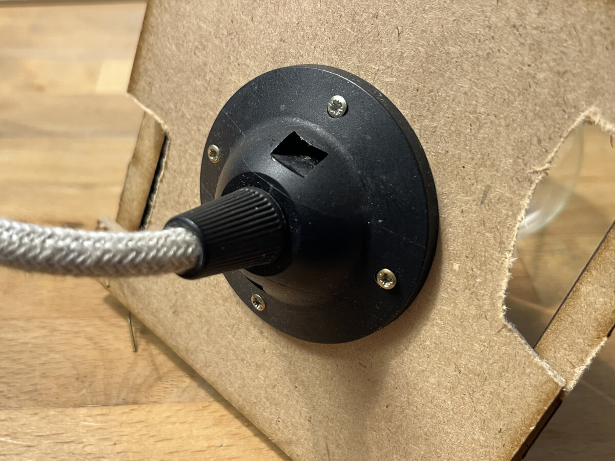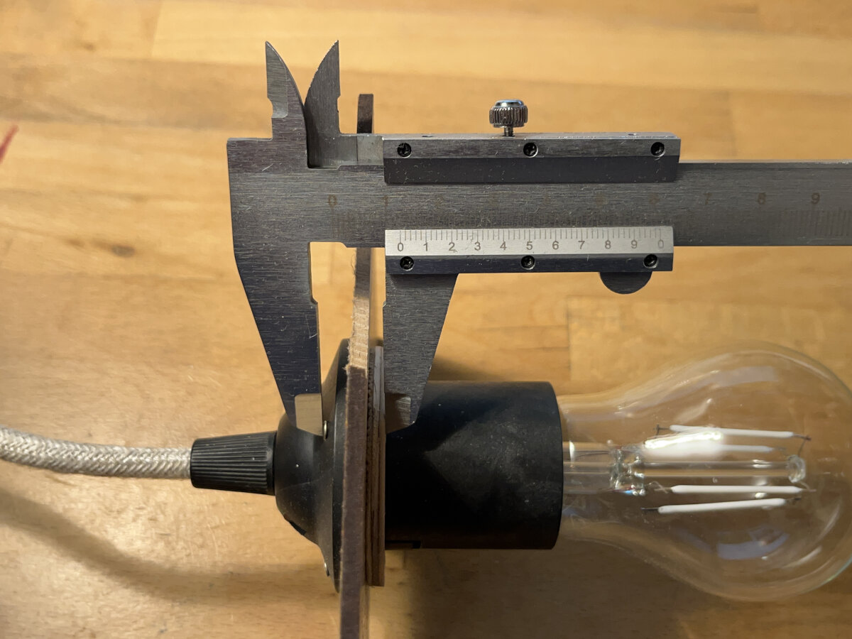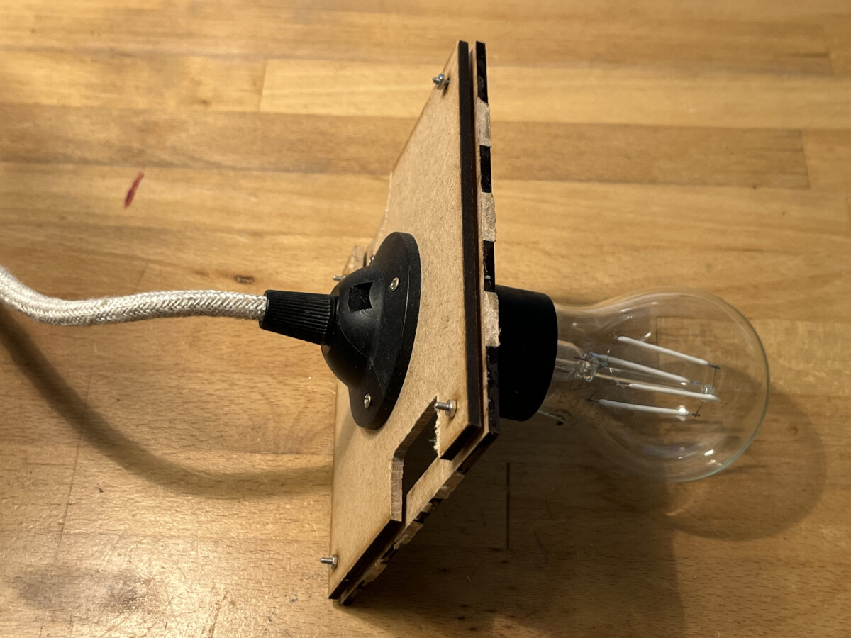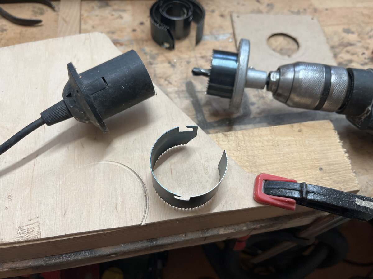 For the installation of the E27 lamp socket, I still needed an adapter plate to prevent the screws (wood, countersunk 2X12) screws from being exposed after installation. At the time I had no access to the laser cutter and needed to manufacture an adapter plate at home with a simple drum saw.