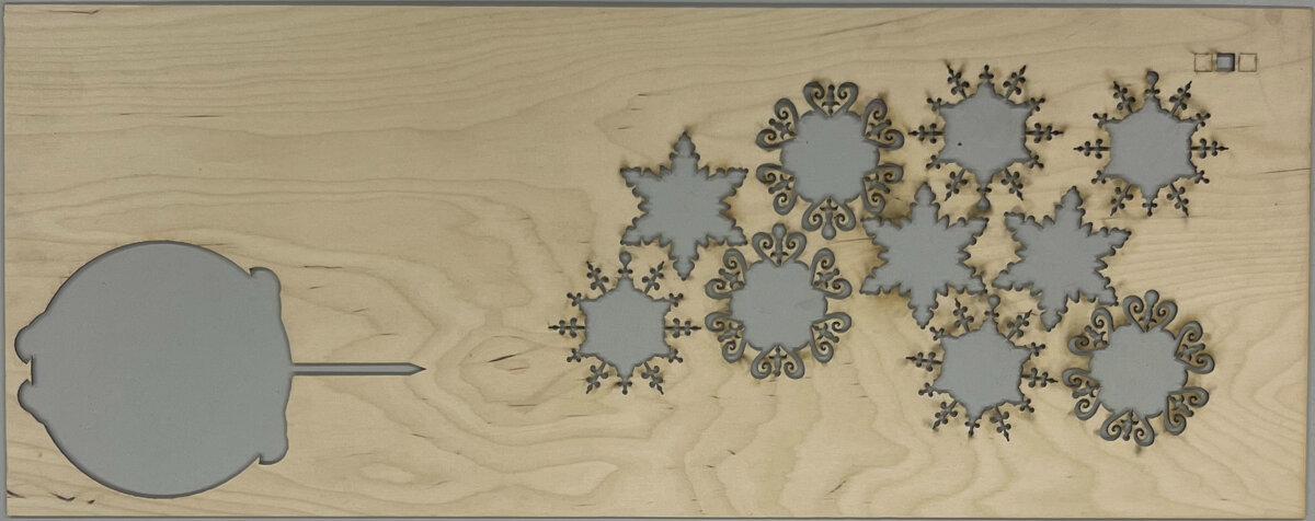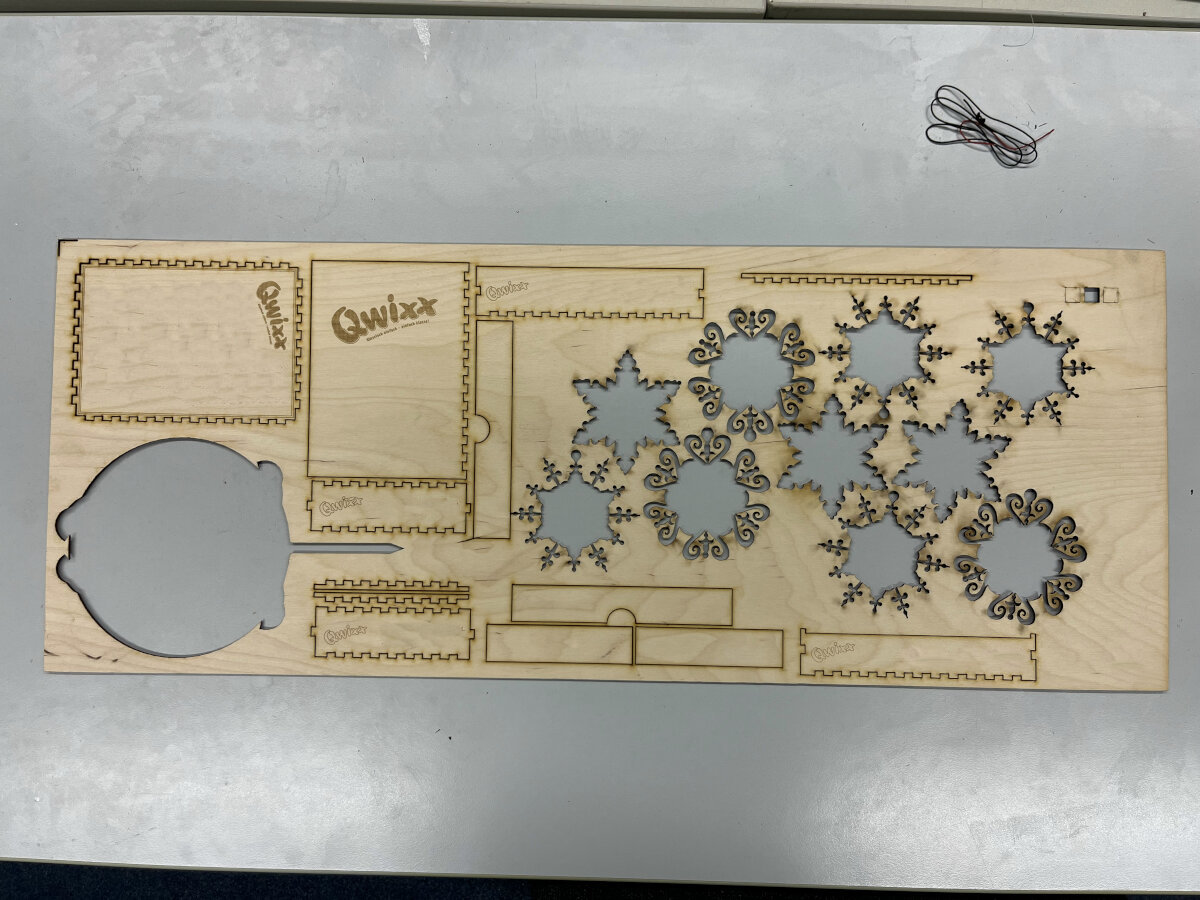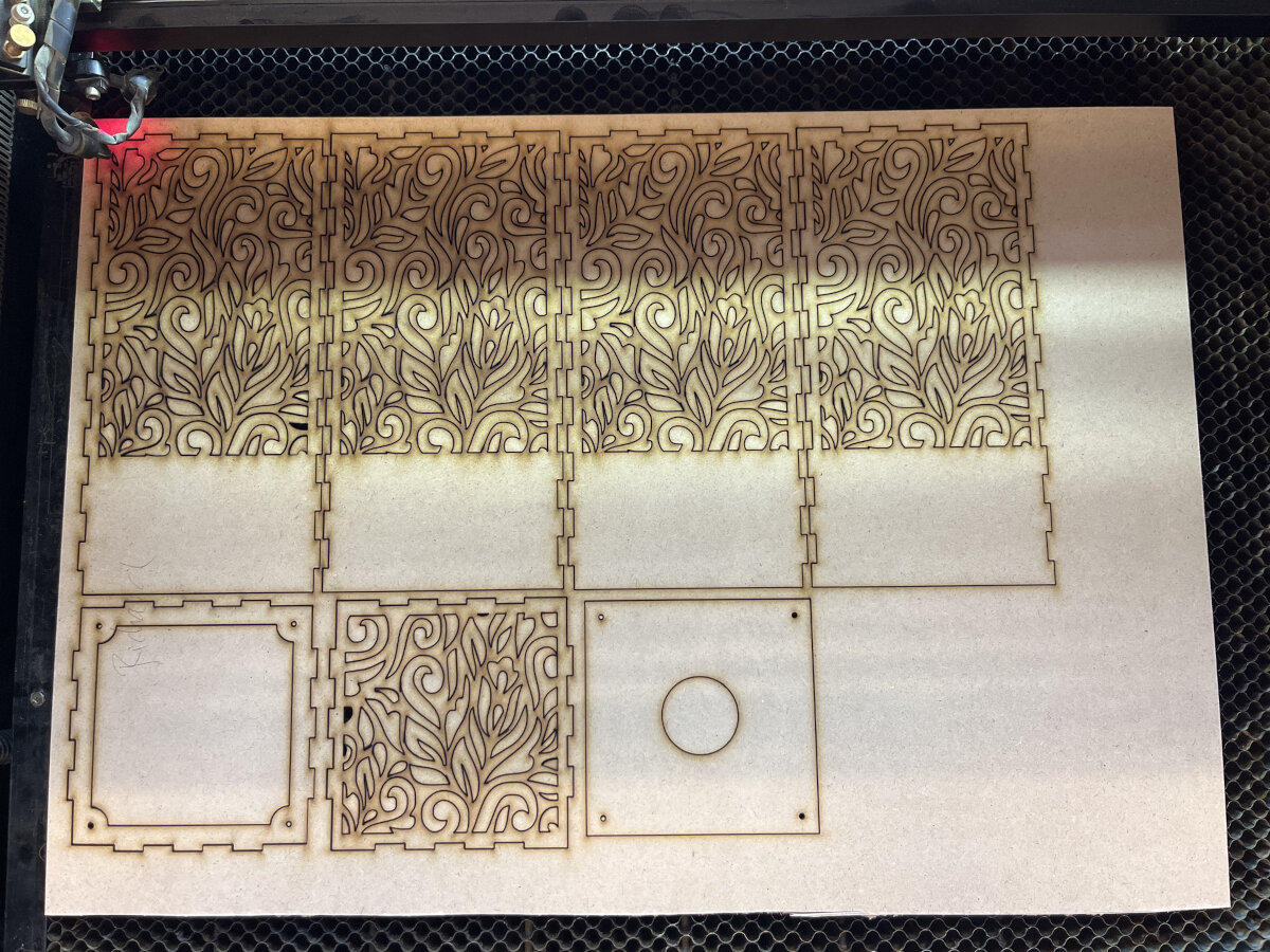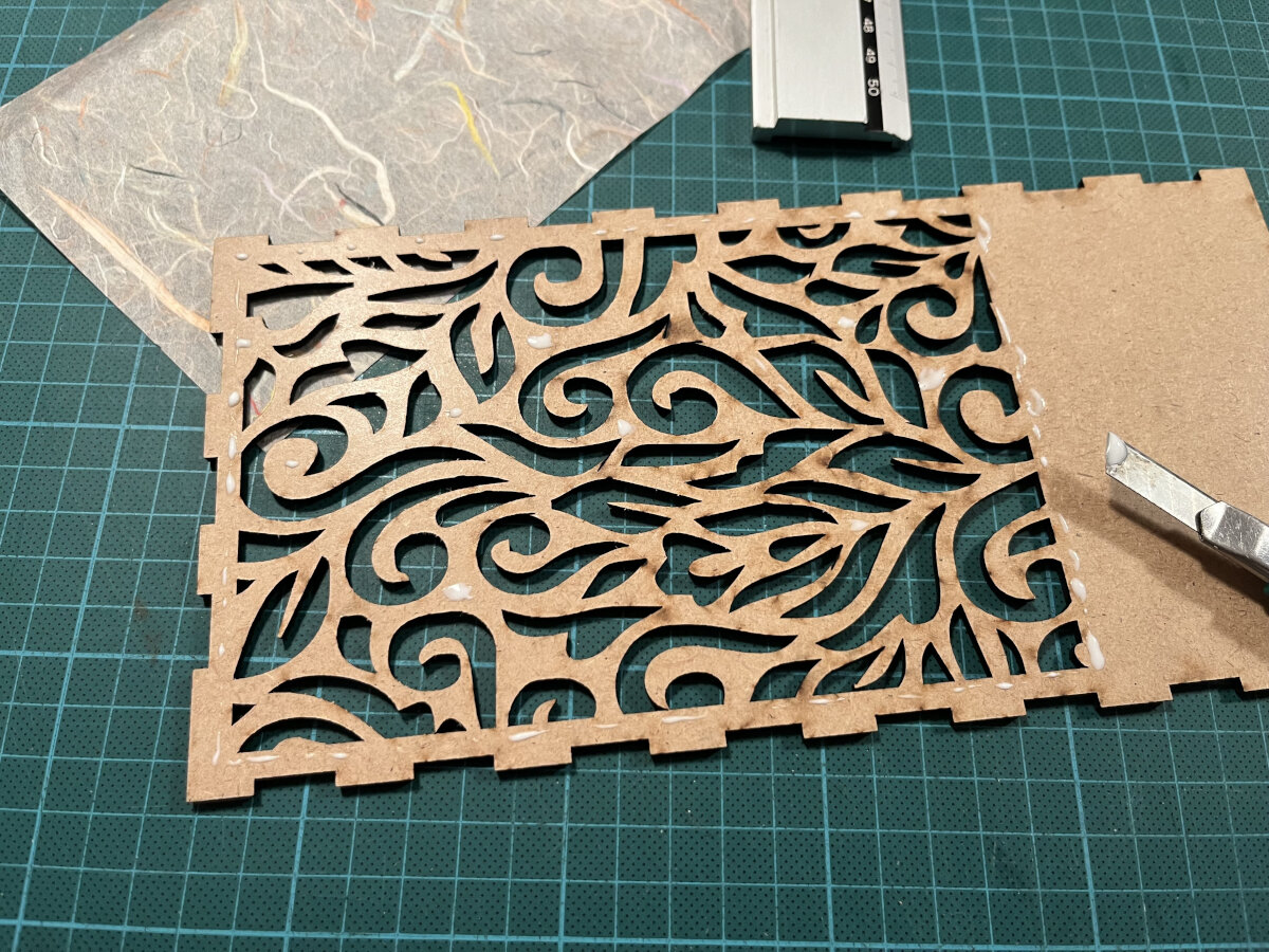 To create the nice opaque effect of the light shining though the laser cut pattern, I used a fiber paper to prevent looking directly into the light source.