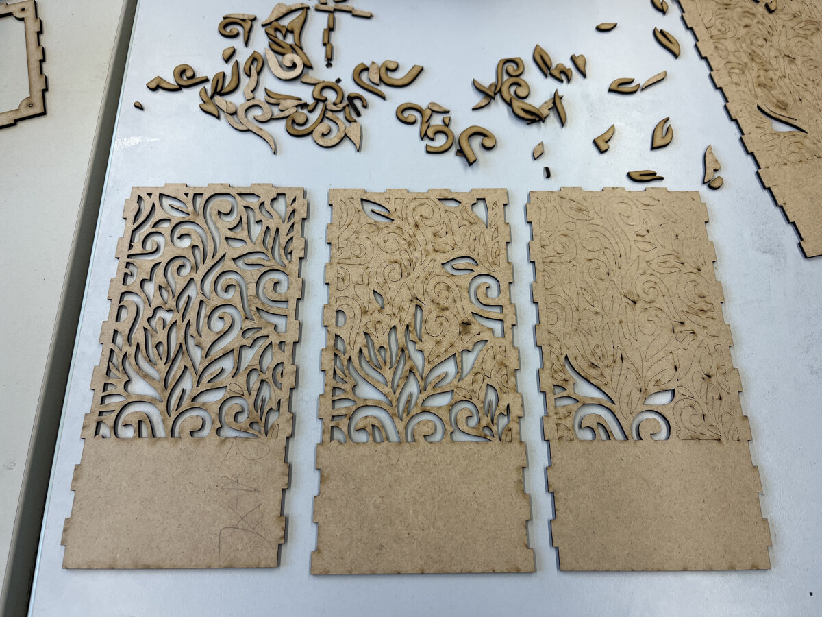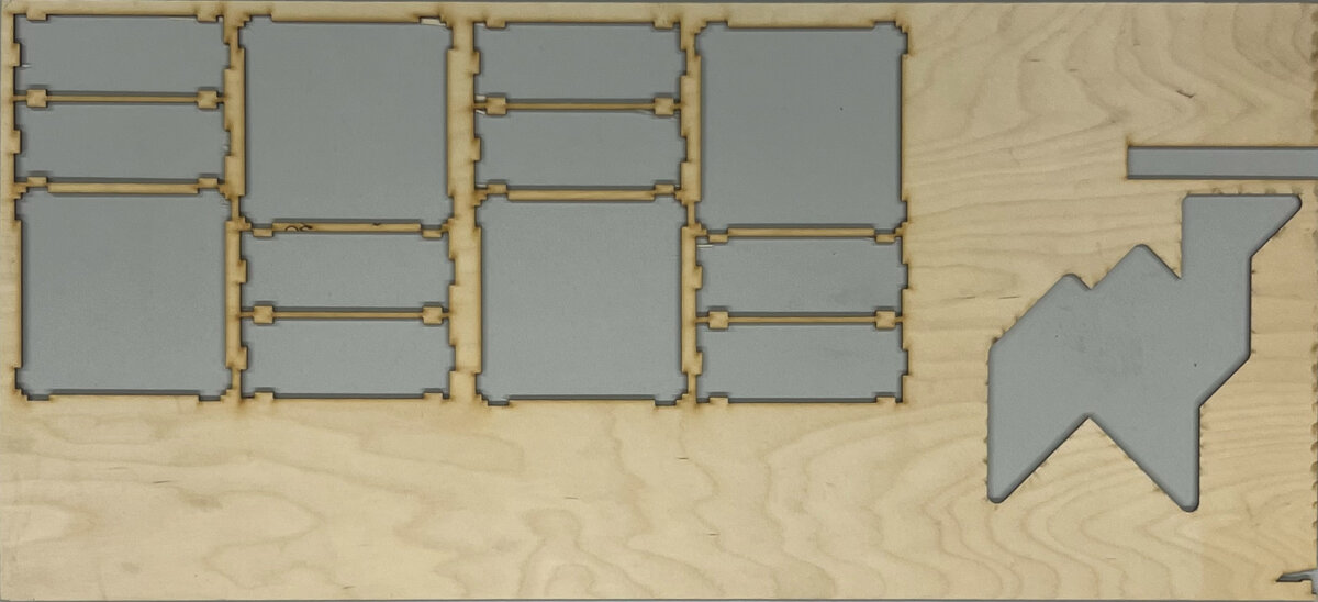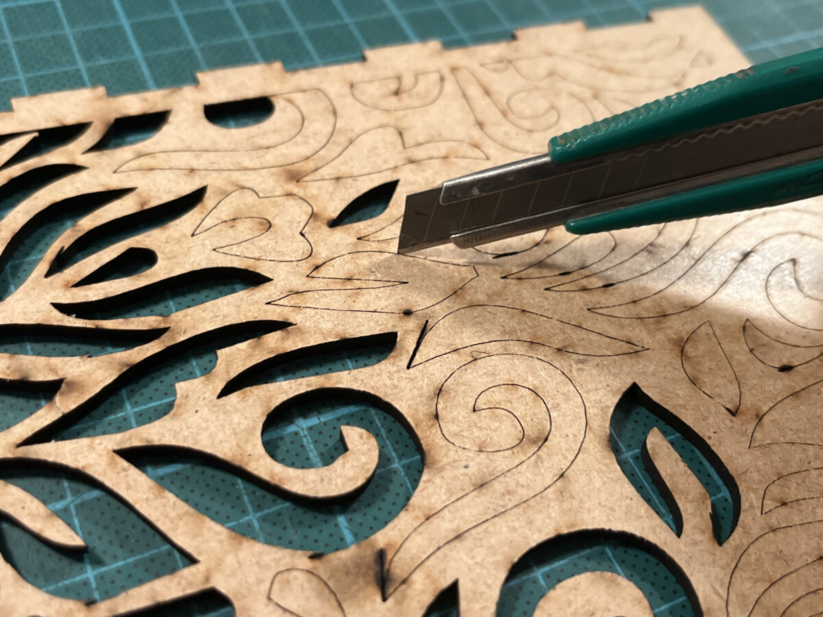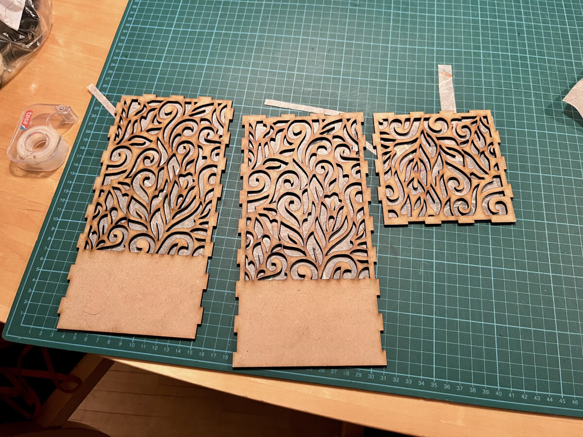 I removed the remaining pieces with a box cutter. I should have adjusted my settings in the first place, removing the pieces took 1,5h of tedious manual work. Now all the laser cut parts were ready for the next steps.