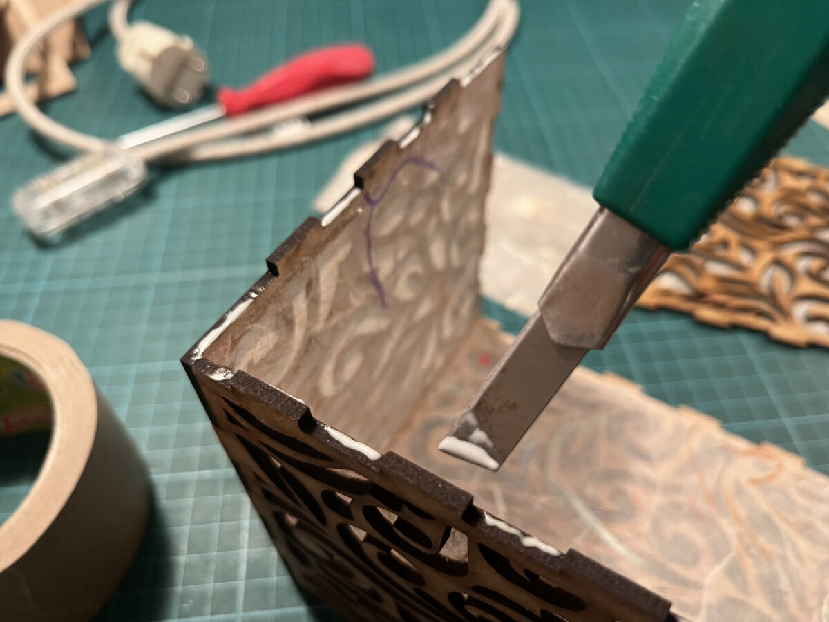 Now it was time to assemble the whole lamp and glue the tabs together. I used the box cutter to precisely apply the right amount of glue, while trying to avoid leakage to the outside.