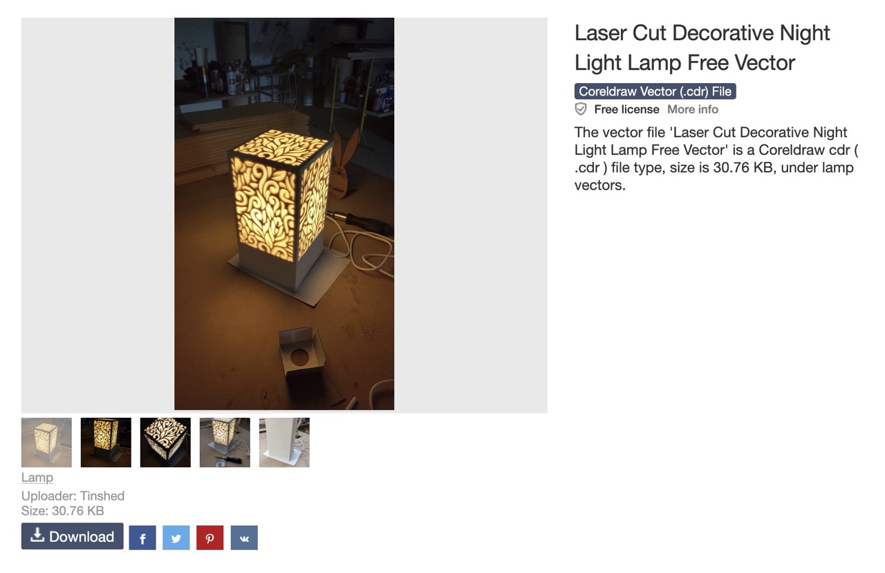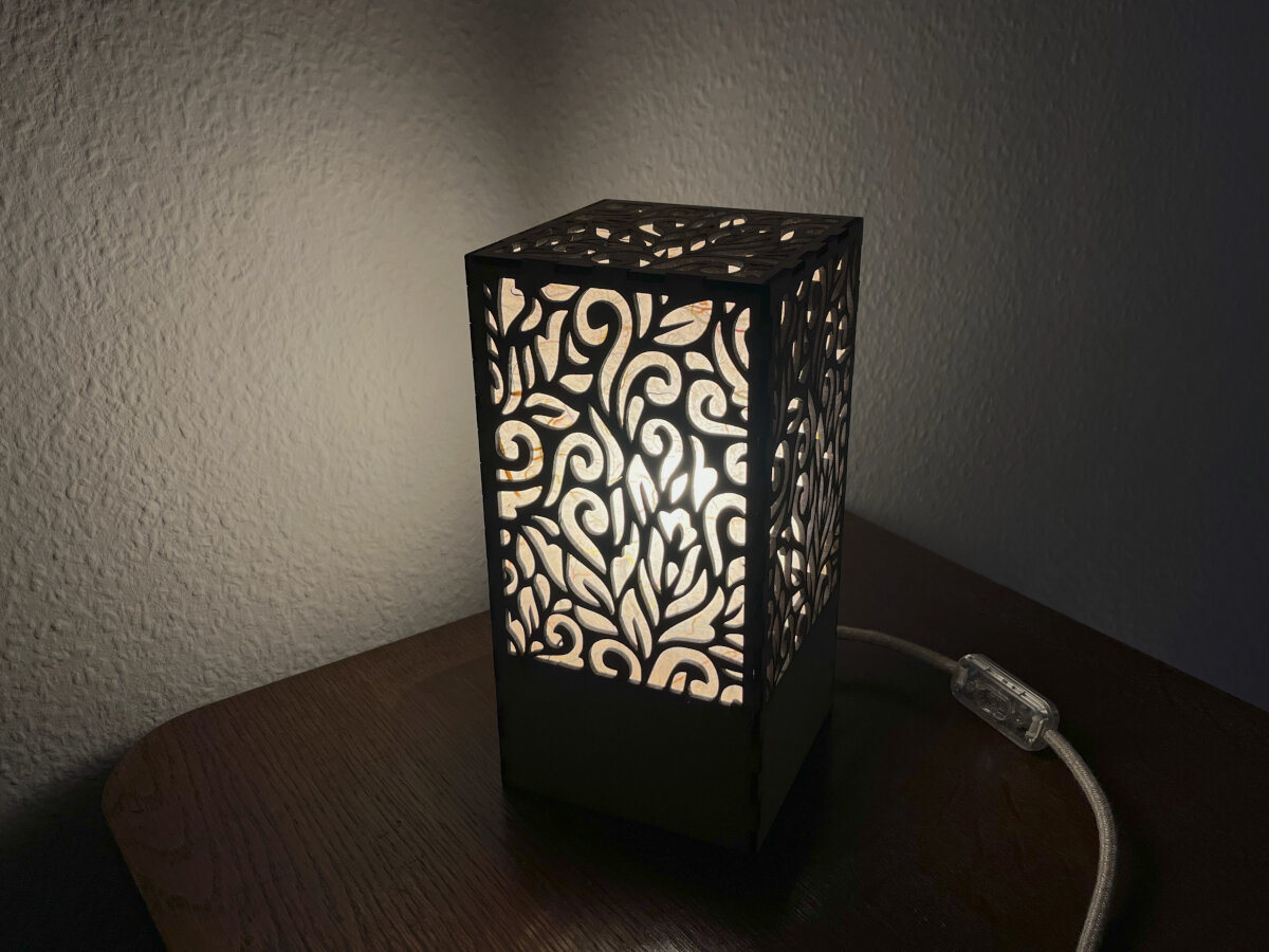 I wanted to build a small desk lamp, which is made of laser cut wood or MDF. Therefore, I scrolled on 3axis.co to inspire myself or maybe find a design which could be modified. After a while and many open tabs, I found a design which I liked. It's called Laser Cut Decorative Night Lamp on 3axis.co. The Lamp is made of a cuboid and some paper or fabric behind the cutouts.
