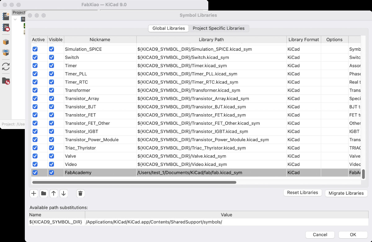 - Restart KiCad and check in the schematics editor if FabAcademy library is available