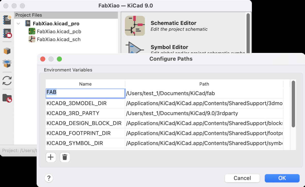 - Go to 'Preferences / Manage Footprint Libraries' and add fab.pretty as footprint library.