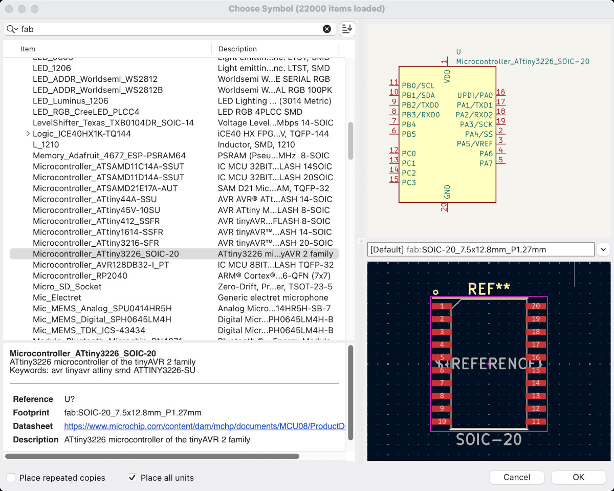 - Go to 'Preferences / Manage Symbol Libraries' and add fab.kicad_sym as symbol library.