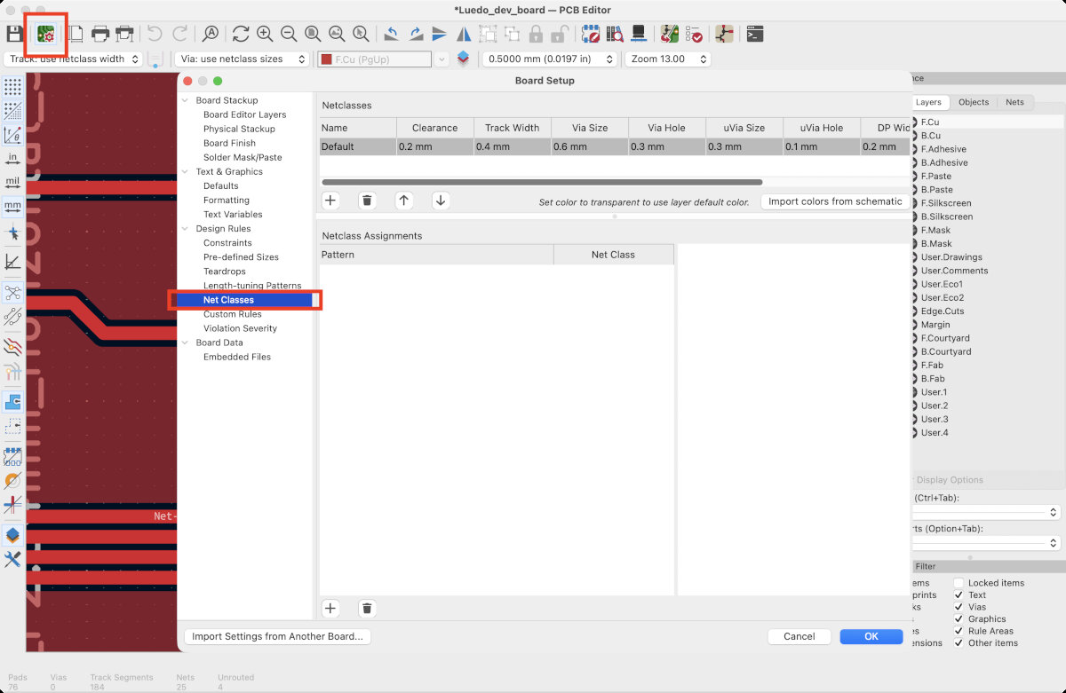 In KiCad the trace width and parameters are defined in the Net Classes which can be found in 'Board Setup' -> 'Net Classes'. Here I inserted the values form above (I choose the typical values).