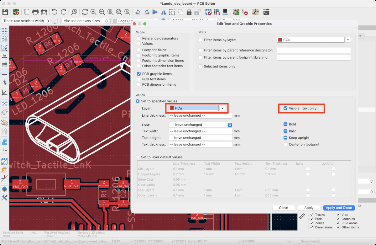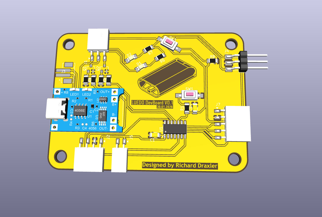 During the .nc code generation of the PCB I realized, that the text was to small and could not be milled into the board. Especially the text 'LUEDO DevBoard V0.1' and the lines of the Luedo glyph were below 0.2 mm line thickness. The text/graphic disappeared in the generated .nc file