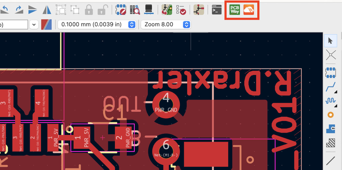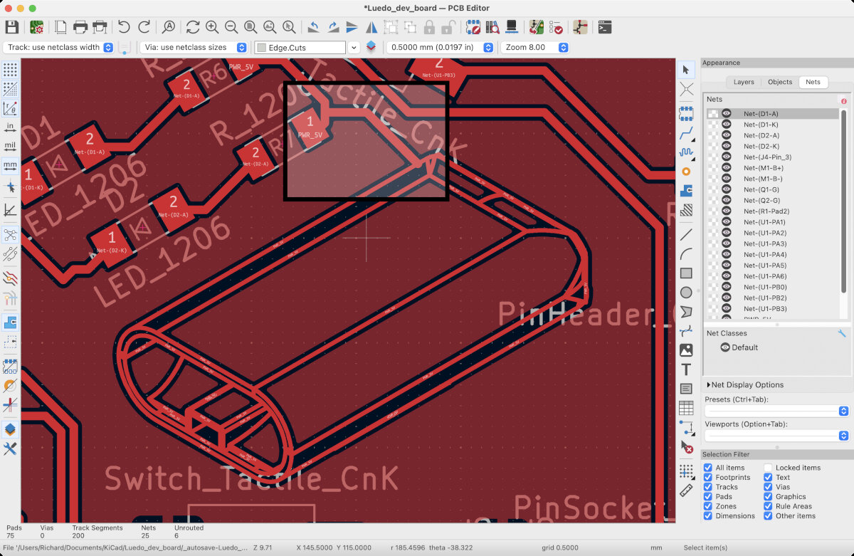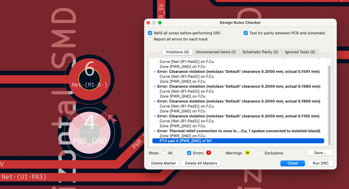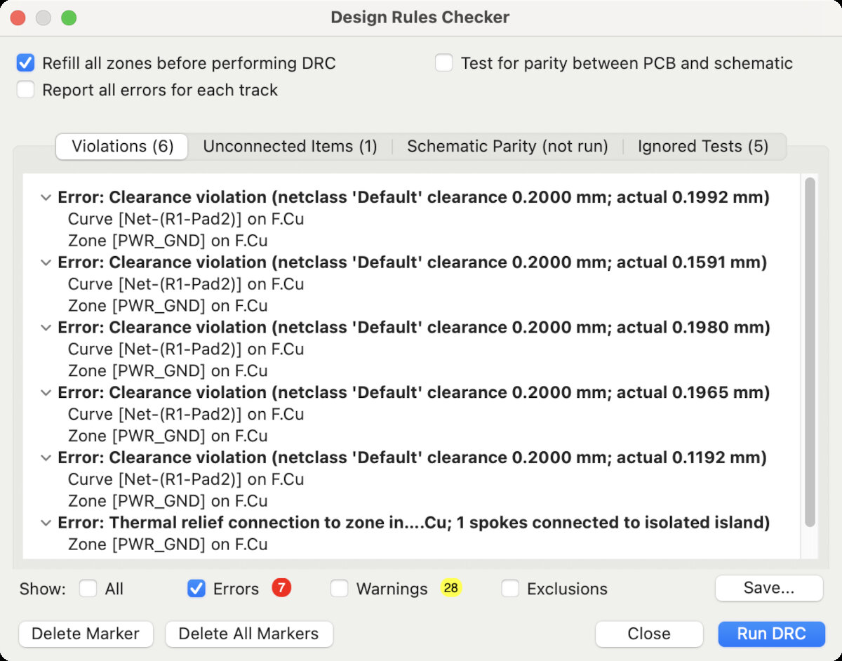 For validating and iterating on my design the DRC was a very useful tool which helped my to find missing connections in my layout. I checked all the markers which appeared on my board and fixed the issues.