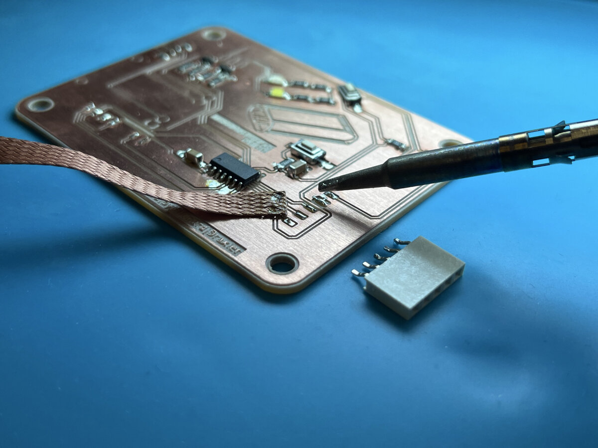 Generally, for the installation, I choose the normal tip of the soldering iron and not our soldering tweezers. My Method was to first solder the ground pad, and then the second part of the component. After the installation of the small 1206 components I moved onto the IC and the buttons. For the connectors, I decided to tin the pads first and then remove the solder with desoldering braid.