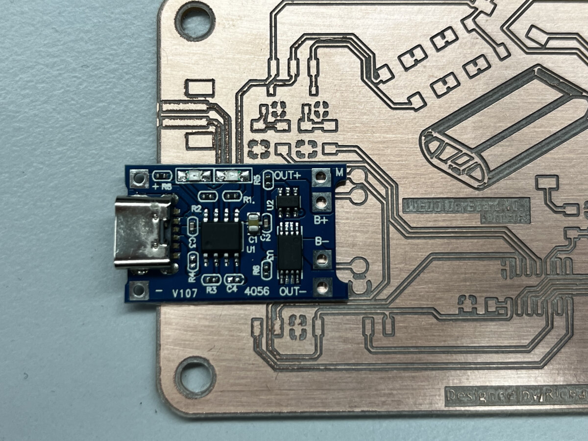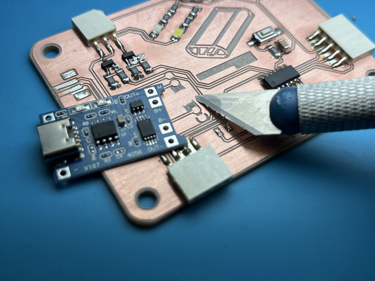 After the board was post processed, I tried to lay out the large components and realized that I made an error in the footprint design for my TP 4056 charging module. I followed a YouTube tutorial for creating the footprint, but never checked my existing modules. Probably there is a second revision, which I currently have which has a slightly different pad layout. Therefore, I need to solder connection wires afterwards.