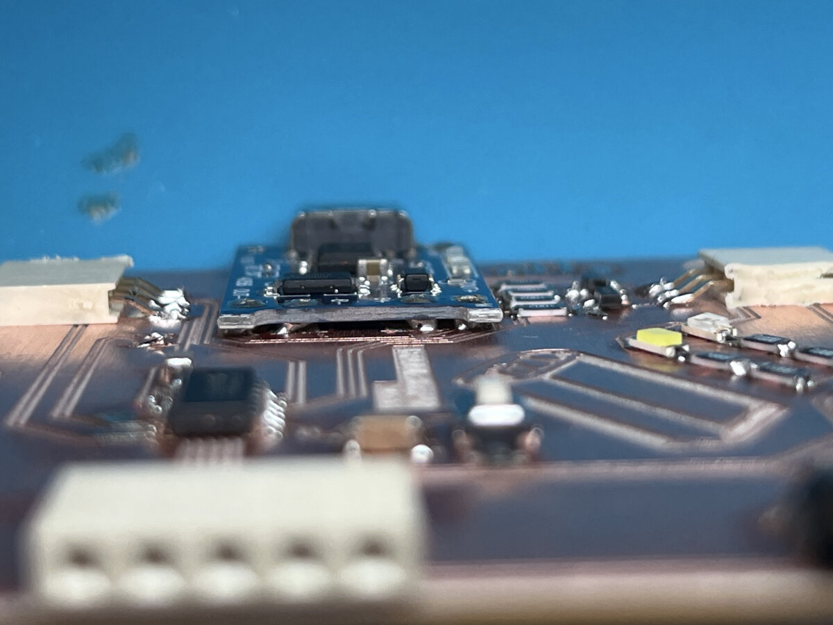The last steps were a couple of repairs. On the lower side of the board I needed to bridge the missing ground pad, which got lost during the milling process. For this repair I used enameled copper wire.
