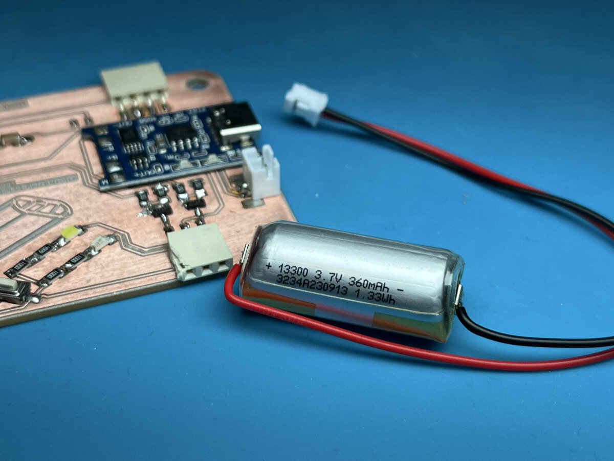 For the battery collector (JST), I only had a through-hole technology (THT) component, so I bent its legs to make it a surface mount component. To power everything for testing purposes, Ferdi recommended that we recycle batteries from single-use vapes. This gives a product that would otherwise be discarded a second life.