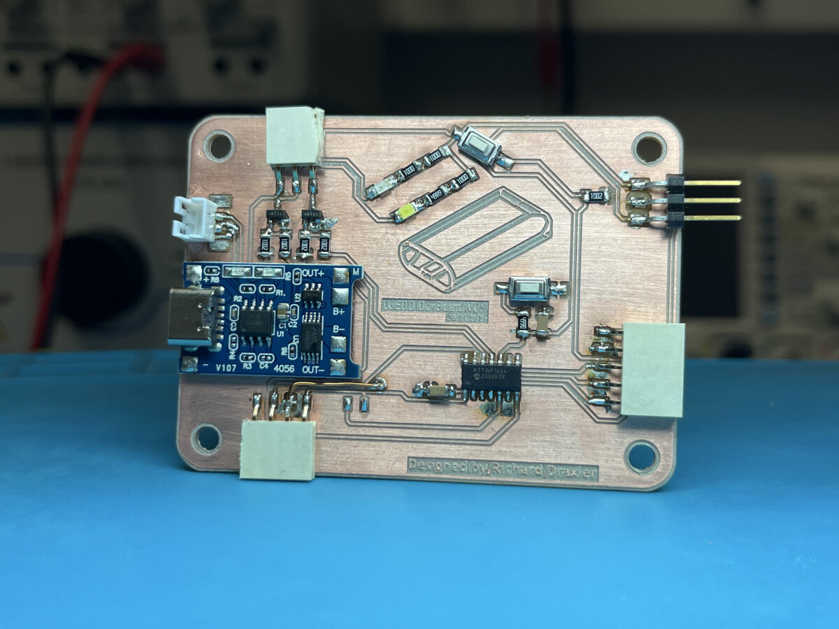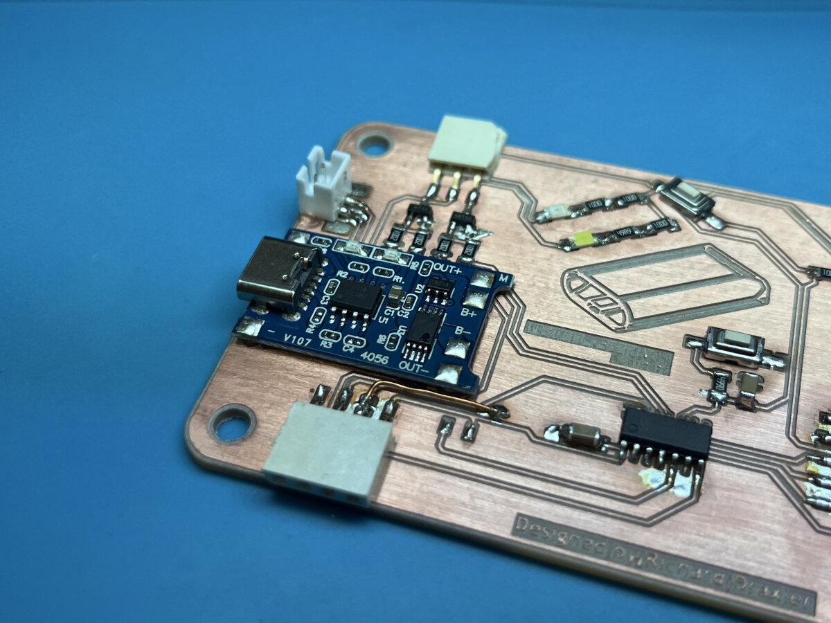 Fully assembled board with connectors, charging IC daughter board, AT1624 MCU, button and leds.