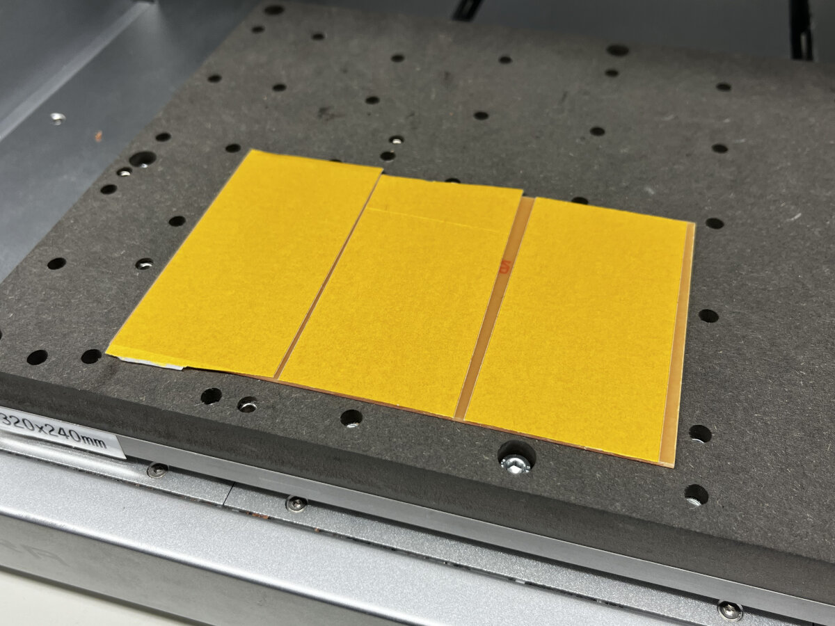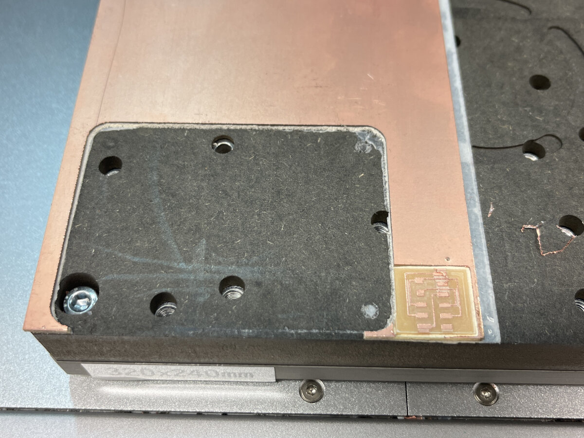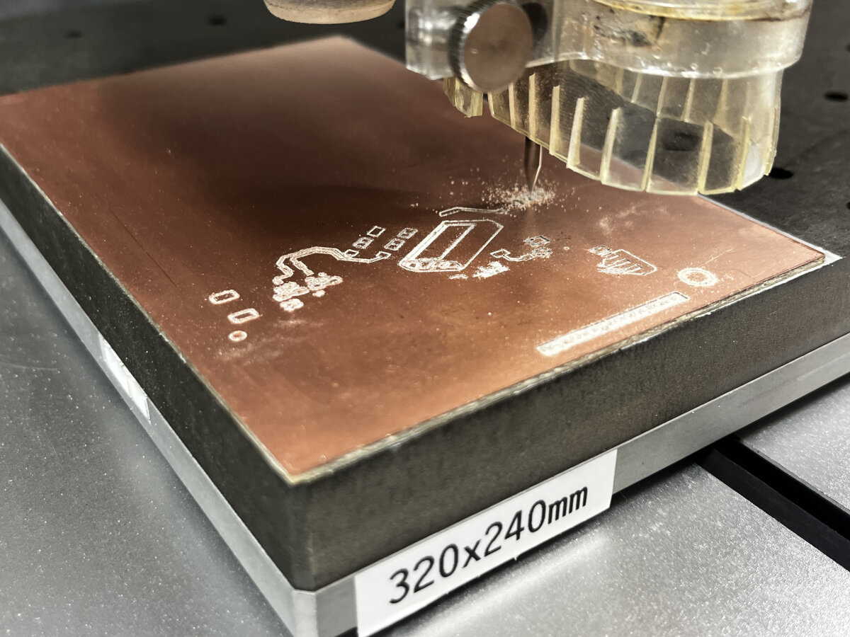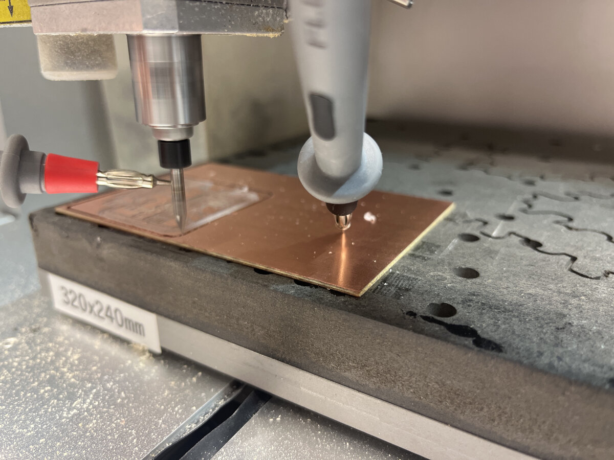 In the first step, I mounted the PCB to the milling bed with double-sided tape.Then I tapped the board and mill with a multimeter and scratched the surface as already shown in the other PCB production above.