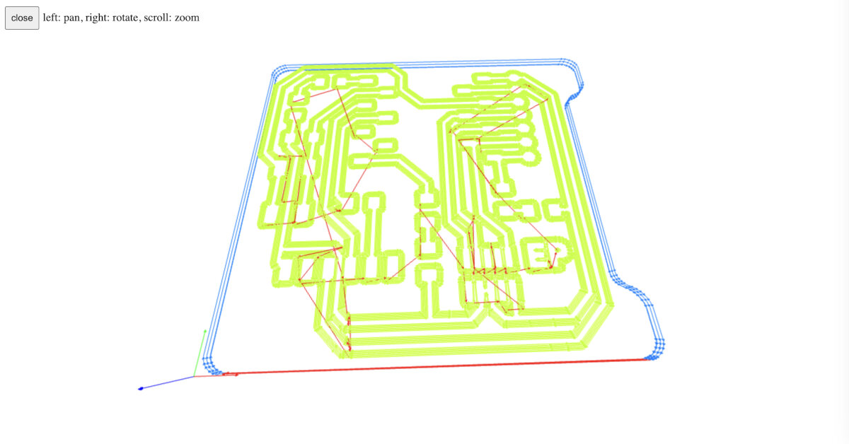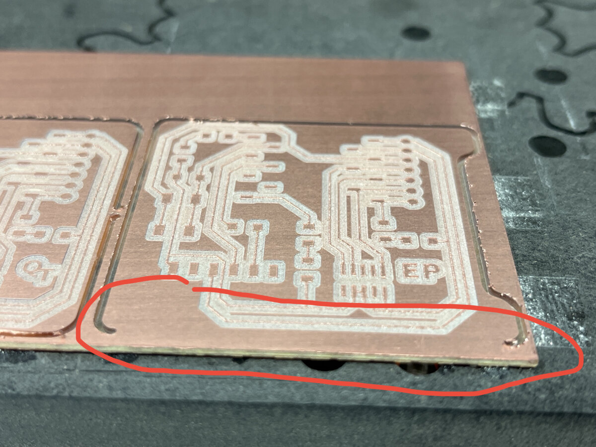 During the Mods processing there is a step called 'offset' which cuts the outer contour of the image. This created an issue with generating the .nc code which resulted in an uncut side of the PCB.