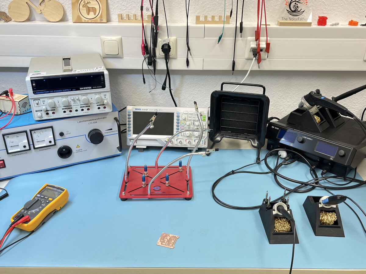 Soldering setup in our lab: Lab bench power supplies, oscilloscope, fume filter, soldering station with: iron, hot air and tweezers