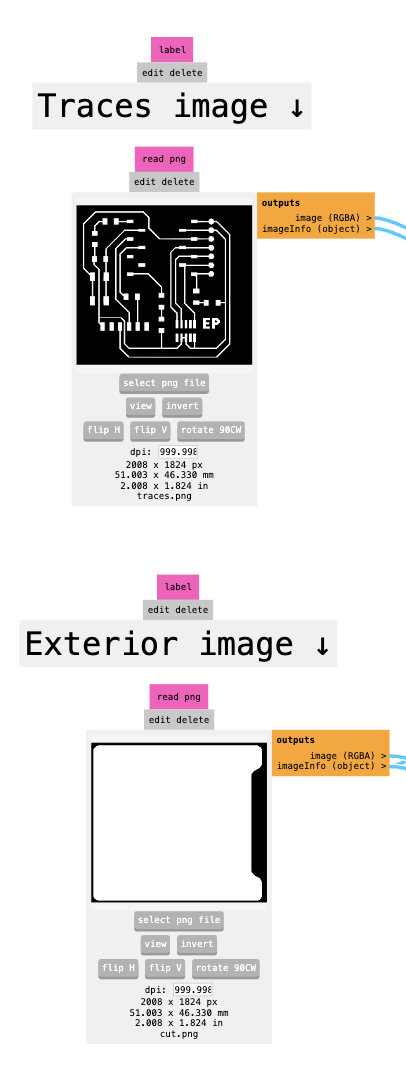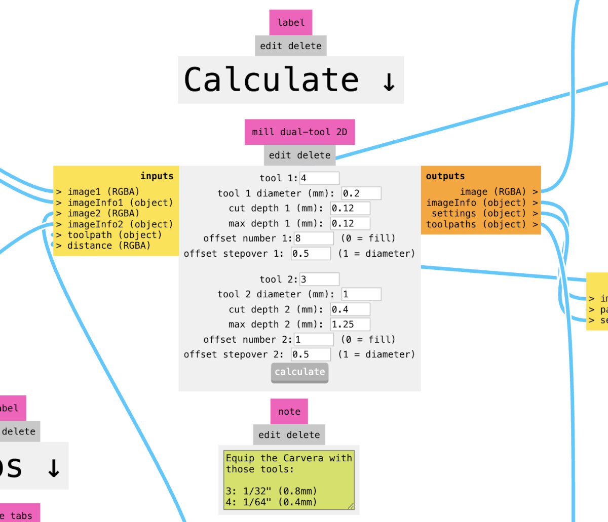 The Cavera mill 2D PCB program is made of different stages/tiles which process the input image and produces the .nc code for milling machines.