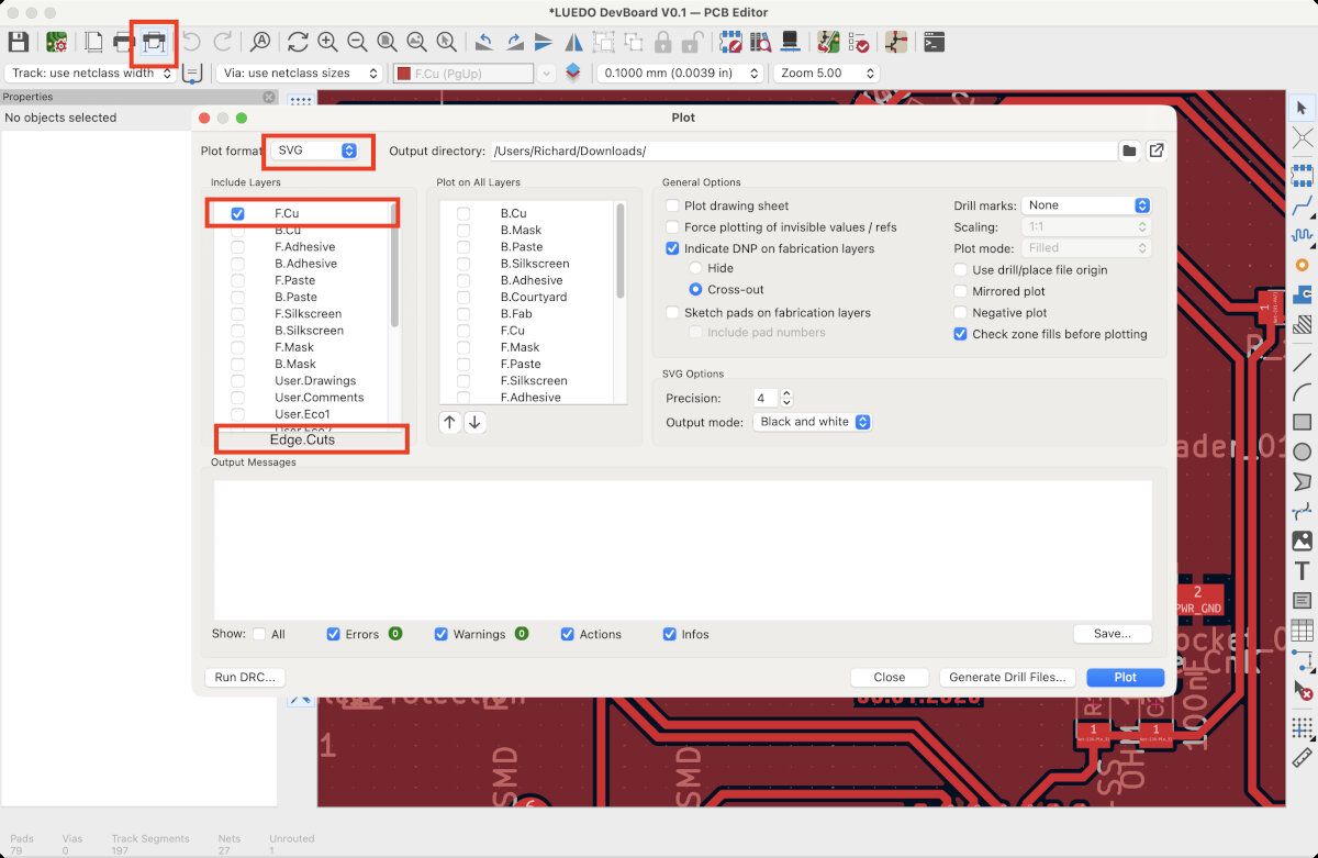 Open KiCad. In the PCB Editor go to 'File' -> 'Plot...' or press the plotter button. Select the svg format and select the desired layers, in this case 'EdgeCut' and 'F.Cu'.