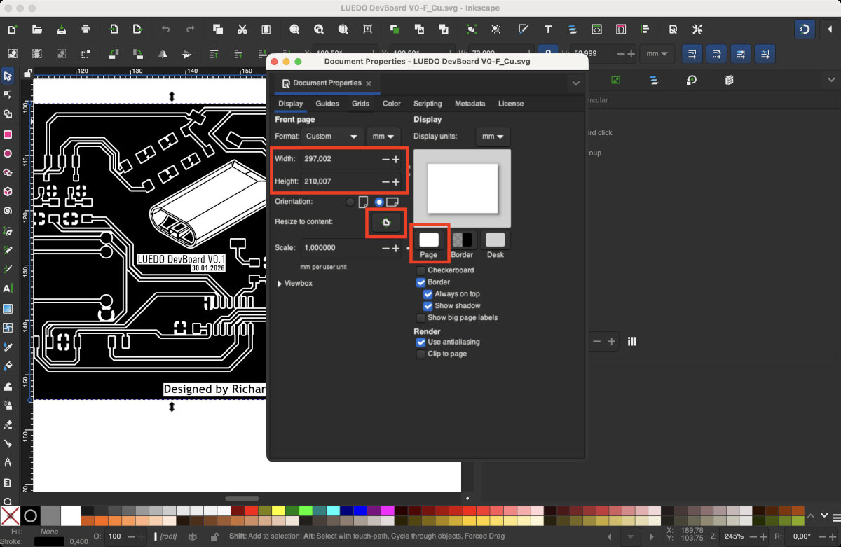 After exporting the layout as .svg, open both files (F.Cu and Edge.Cuts) in Inkscape. Go to 'File' -> 'Document Properties' and: