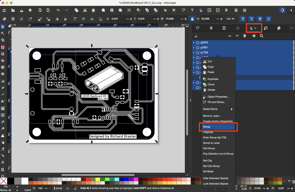 During the .nc code generation of the PCB I realized, that the text was too small and could not be milled into the board. Especially the text 'LUEDO DevBoard V0.1' and the lines of the Luedo glyph were below 0.2 mm line thickness. The text/graphic disappeared in the generated .nc file.