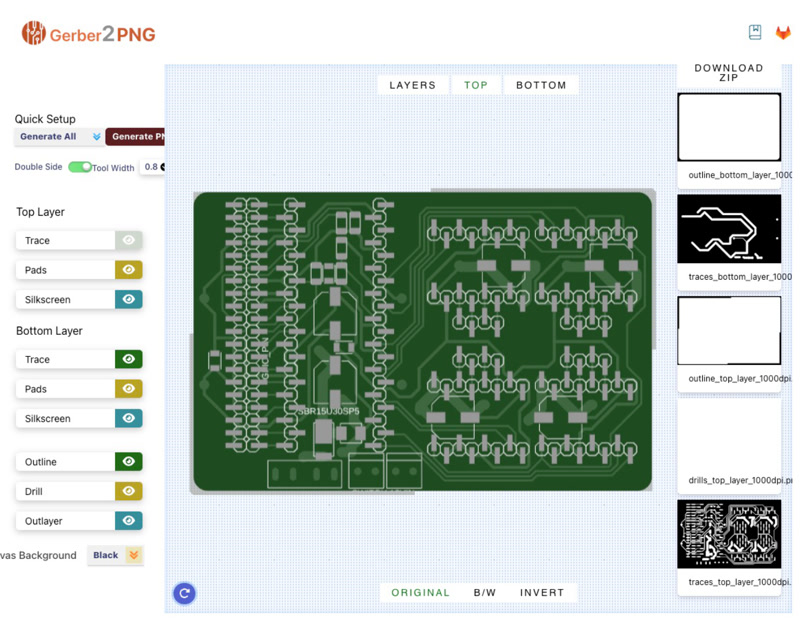 I tried using Gerber2Png from FabLab Kerala to generate PNGs for a double-sided PCB following the Documentation.