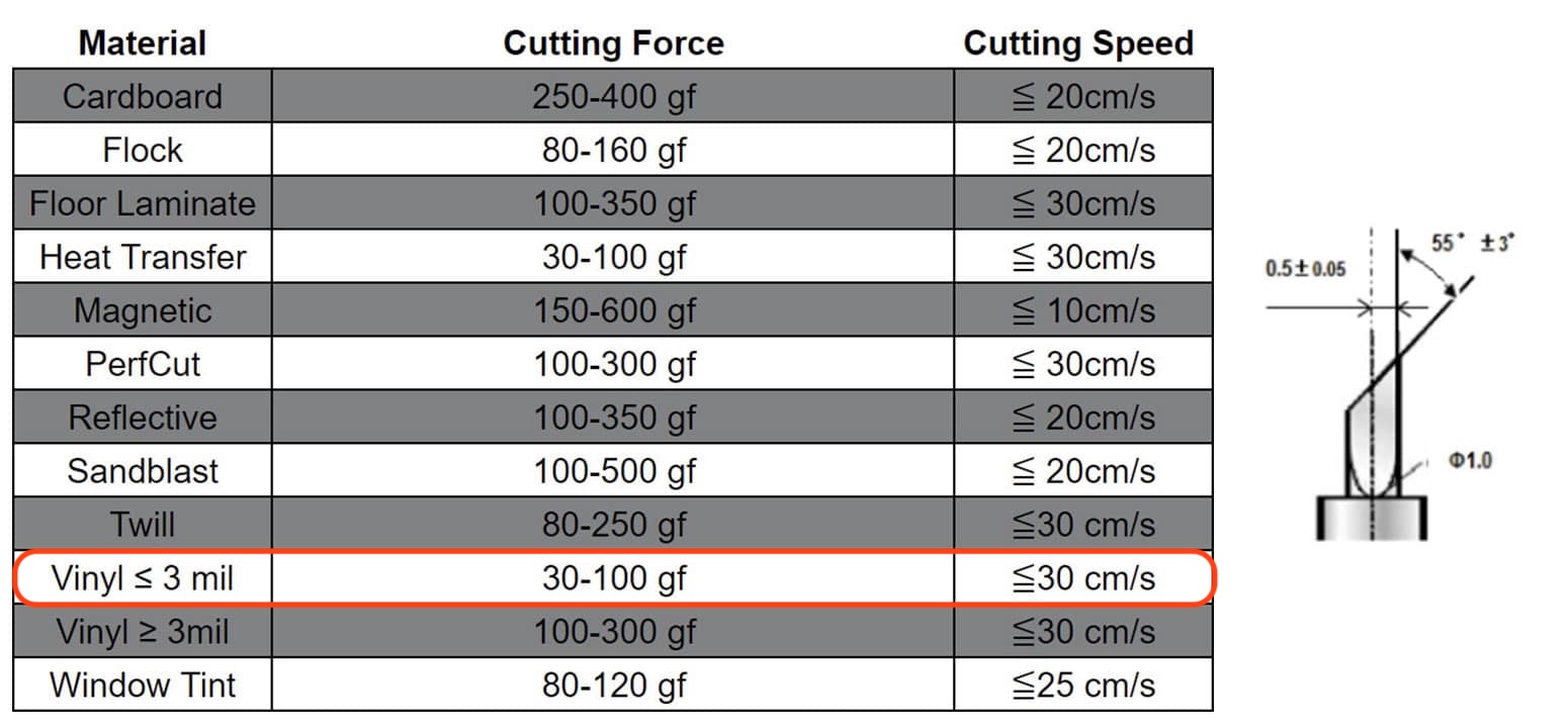 table lists some suggested parameters for different materials. As we are cutting a thin vinyl, a relatively high