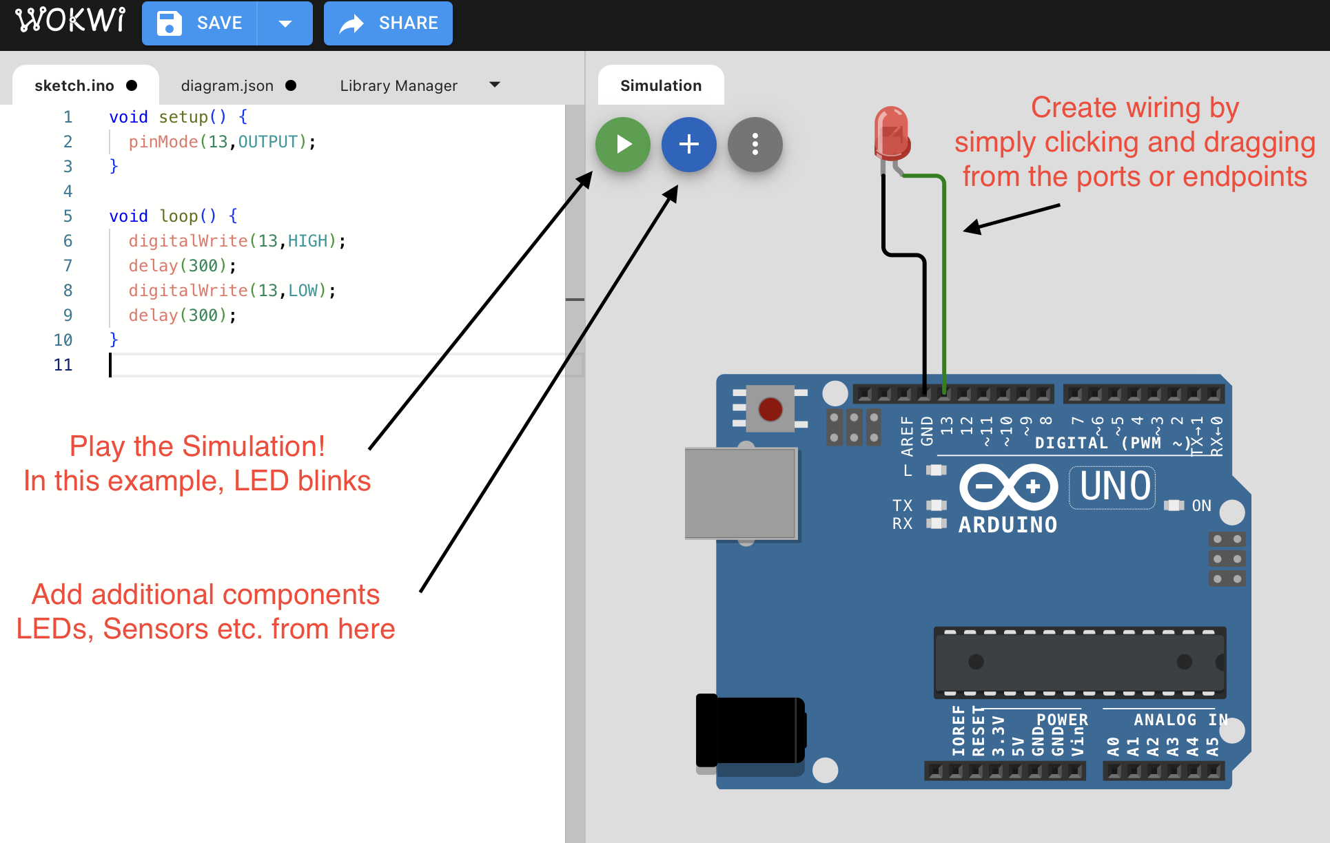 There are buttons to start the simulation as well as to add components. Wiring is easily accomplished by simply clicking a pin on the microcontroller or on the component and just dragging it to the endpoint.